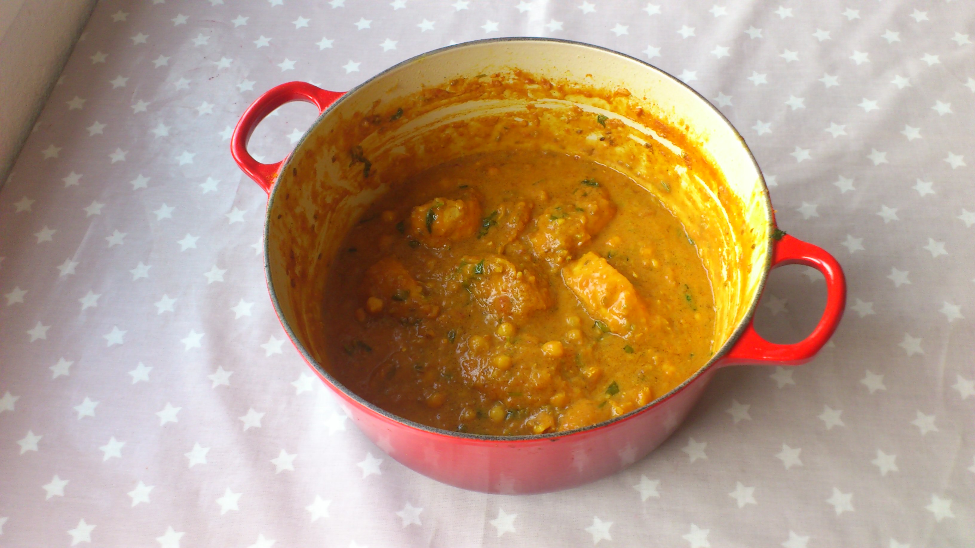 Oppskrift fra River cottage som måtte prøves ut i dag, Indisk kylling curry servert med nanbrød, ris og en frisk «salat», dvs. diverse grønnsaker i store biter med litt naturell yoghurt krydret med spisskummin som dressing.