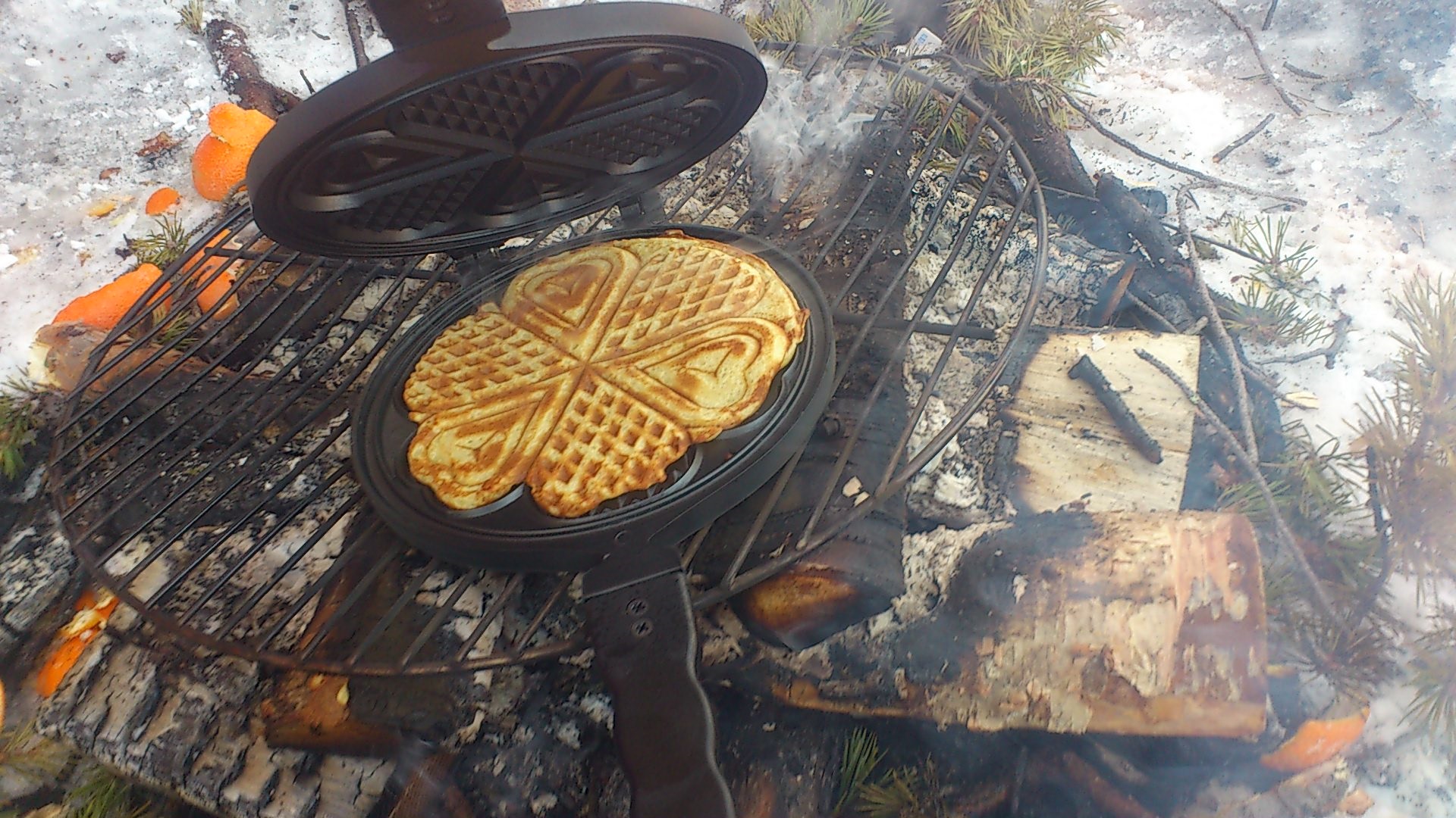 «Marit, du sprer så mye glede» sa min kjære venninne til meg i dag. Det setter jeg selvfølgelig veldig pris på å høre (og er noe man kan ta med seg til svartere dager). Uttalelsen ble framkalt av kanskje verdens beste vafler stekt på bål med mitt nye turvaffeljern. Vi avslutta en flott påskeferie med tur til den nye gapahuken på nedsiden av trykkbassenget, på Stakkevollan, vårt turparadis. Oppskrifta kommer fra Sjømannskirka i København, som visstnok sliter ut 6 vaffeljern i året og sprer glede hver dag året igjennom. Selv om de nå må skifte navn:-)