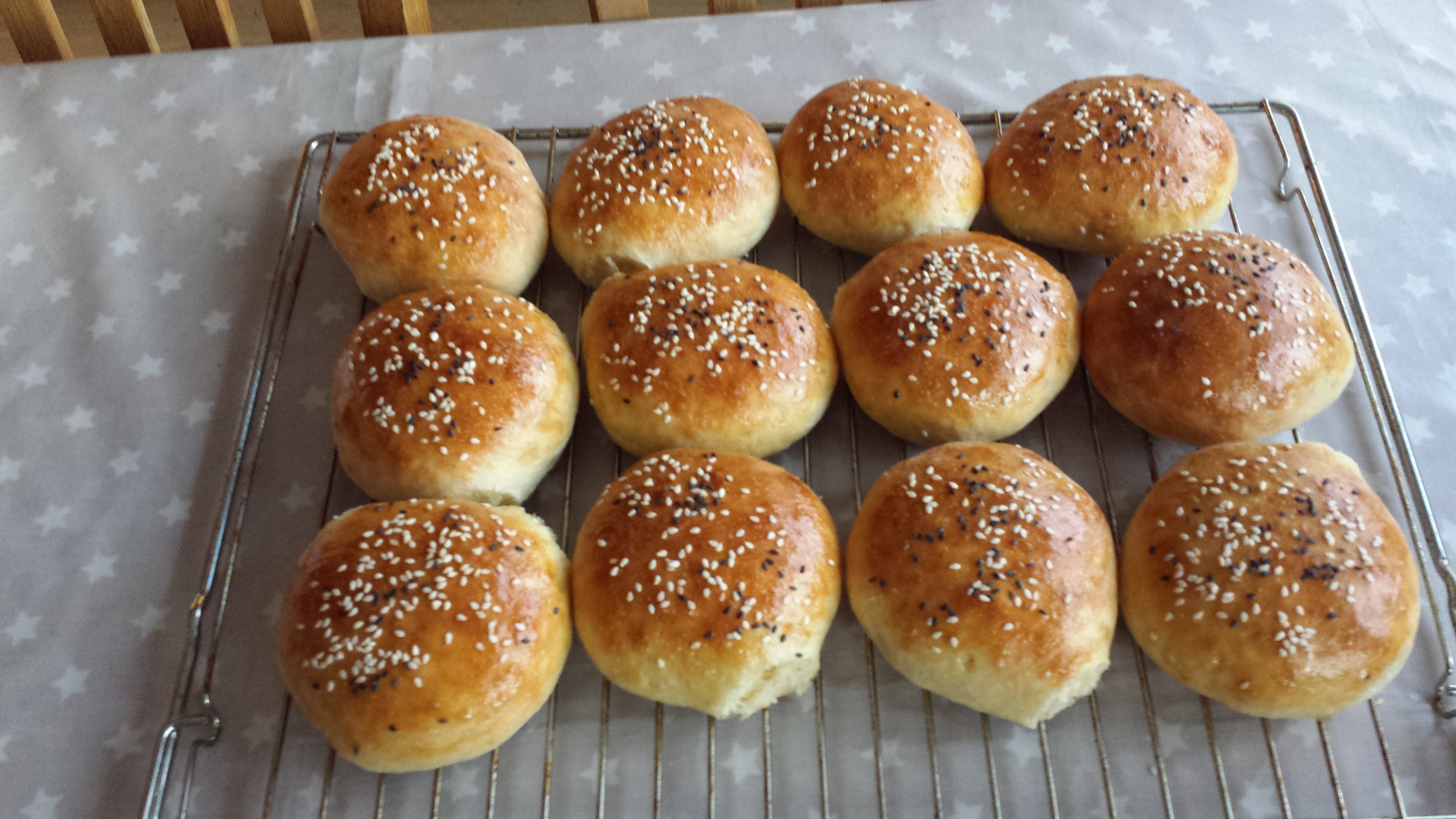 Lag en god og smidig deig, sett til heving til dobbel størrelse. Bak ut 12 boller – trykk dem godt ned og la stå å heve ca en halvtime til. Stekes på 215 grader i ca 10 – 15 minutter.