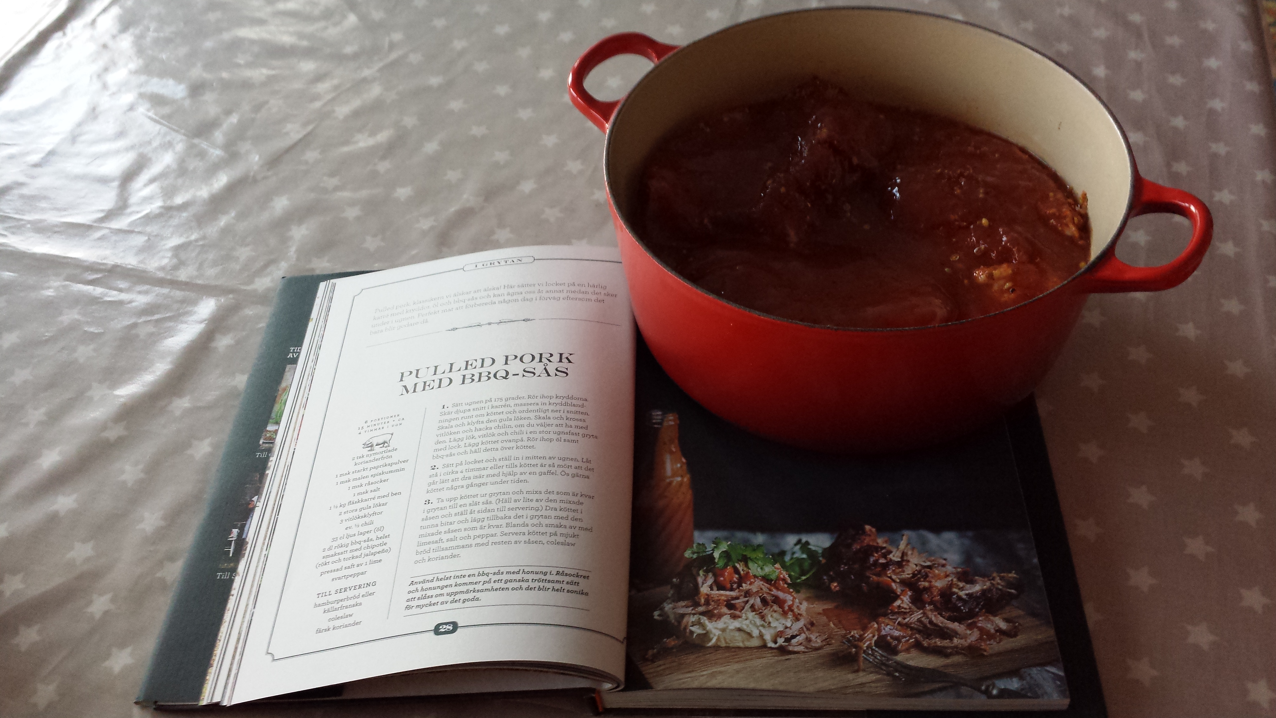Hva er Pulled pork lurer du kanskje på? Det er langtidsstekt svinekjøtt, som man spiser som en hamburger, med tilbehør som coleslaw og barbequesaus. Denne retten har dukket opp «overalt» de siste månedene og nå var tiden inne for å teste den ut! Takk til prøvekaninene – det falt visst i smak! og det beste av alt – den lager seg praktisk talt selv, perfekt søndagsmiddag altså!