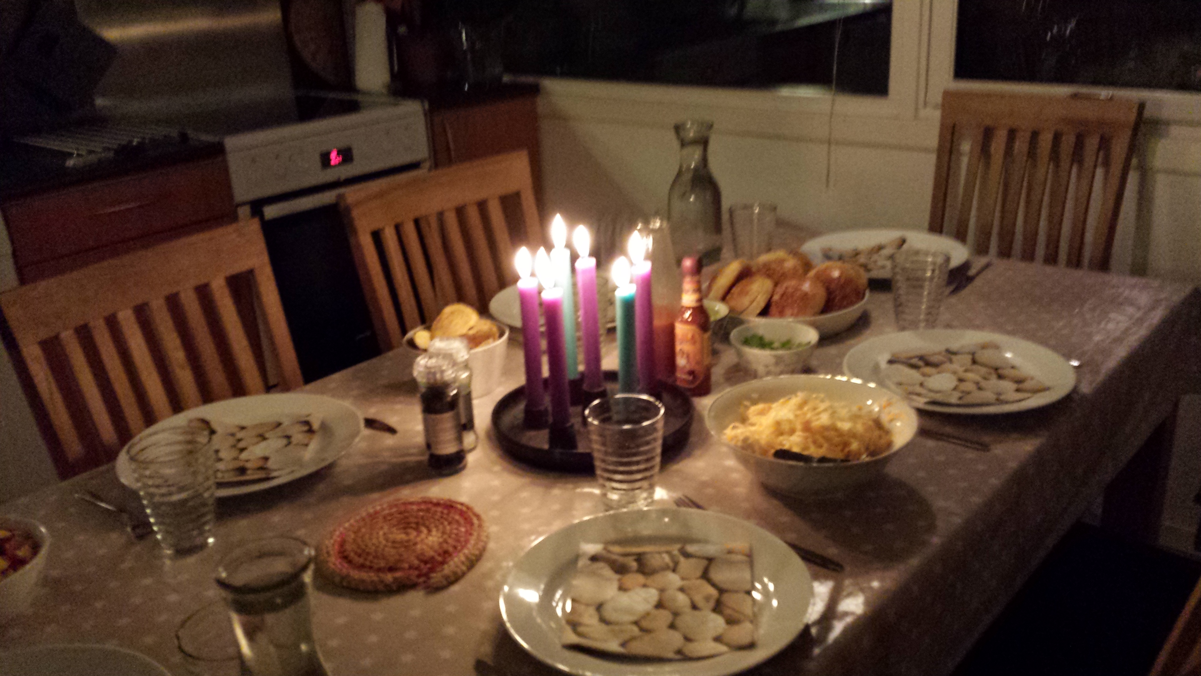 Jeg serverte med hjemmelagde hamburgerbrød, coleslaw, en mango- og tomatsalat og avokadoyoghurt, også Bbq-sausen da. Her venter vi bare på gjestene og kjøttet: