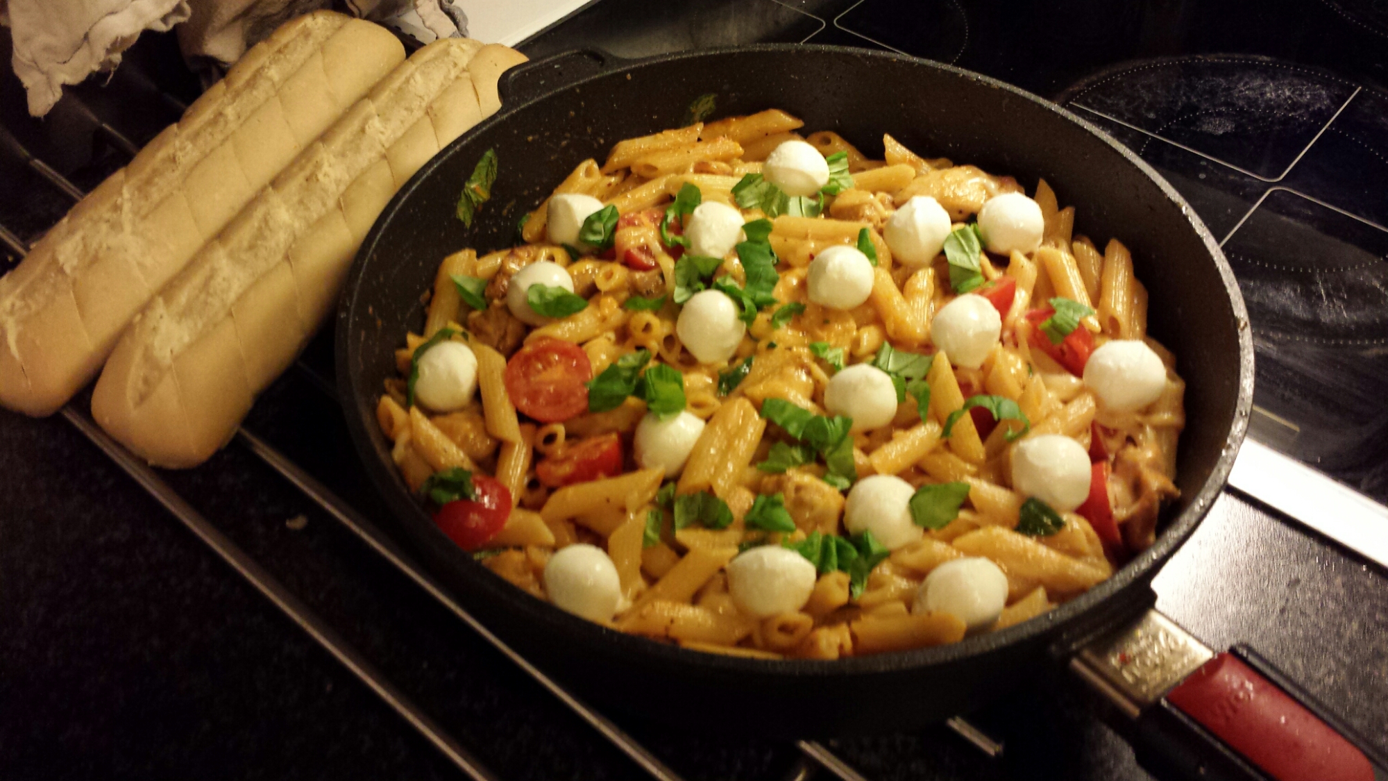 Når pastaen koker steker du kyllingen, krydre med salt, pepper og et lite dryss med paprikapulver (jeg bruker røkt paprikapulver her) og tørkede chili flak. Ha så pastasausen, fløten, parmesanen, tomatene og basilikum oppi sammen med kyllingen. Ha deretter i den ferdig kokte pastaen. Ha over revet mozzarella og rør rundt.