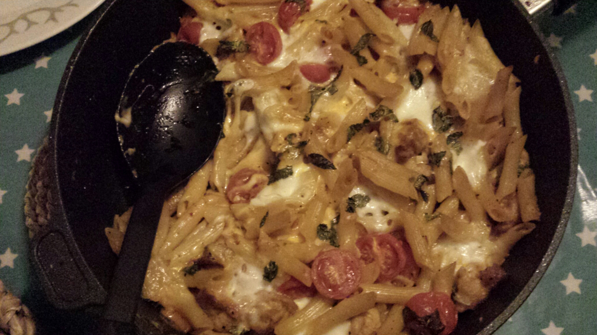 Hell pastablandingen i en ildfast form (eller hvis du steker i en stekepanne som kan settes i ovnen bruker du bare den). Strø på resten av basilikumen og legg fersk mozzarella på toppen . Stek i ovnen ca 20 min til osten er smeltet og alt har fått en fin gylden farge.