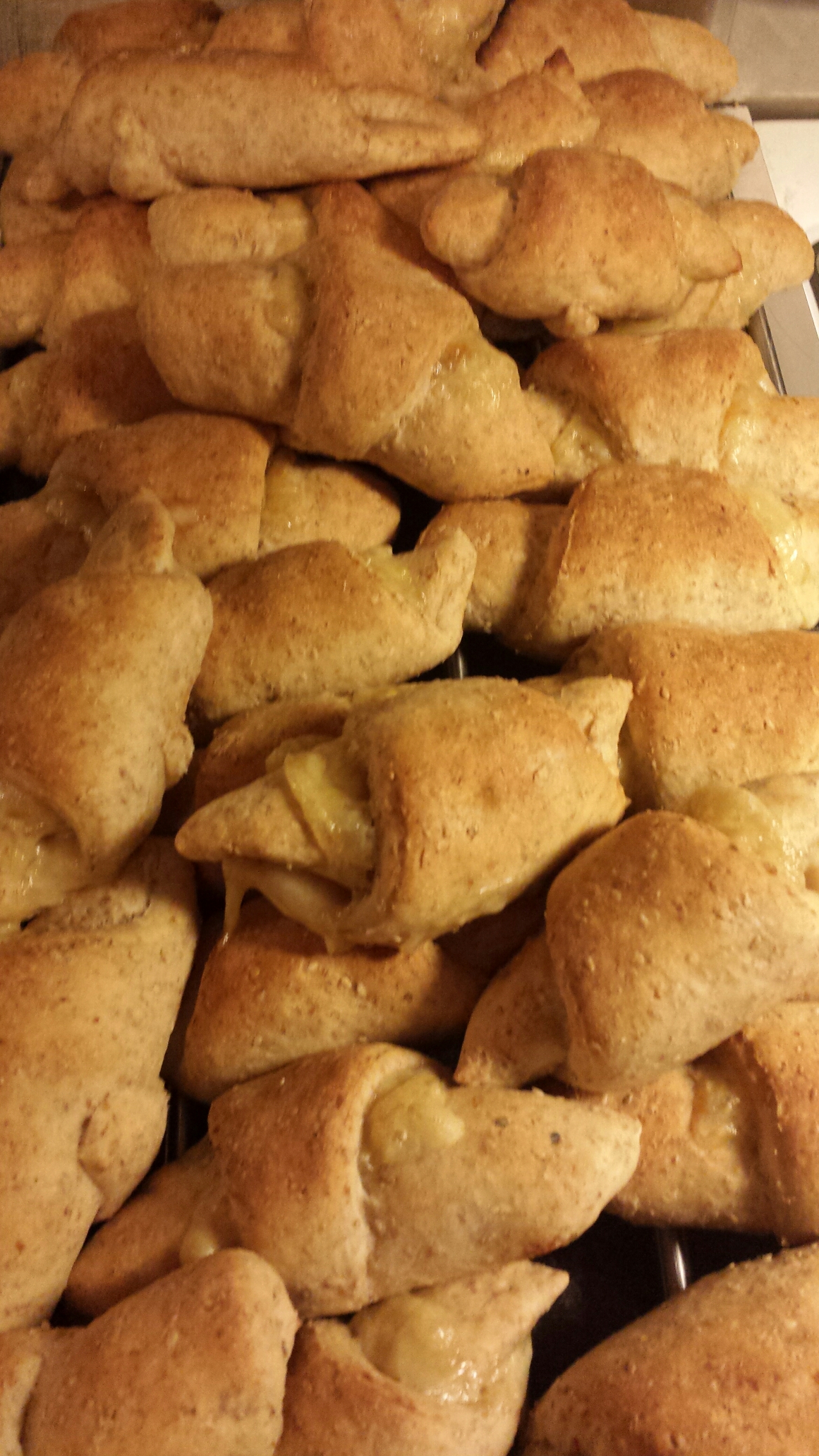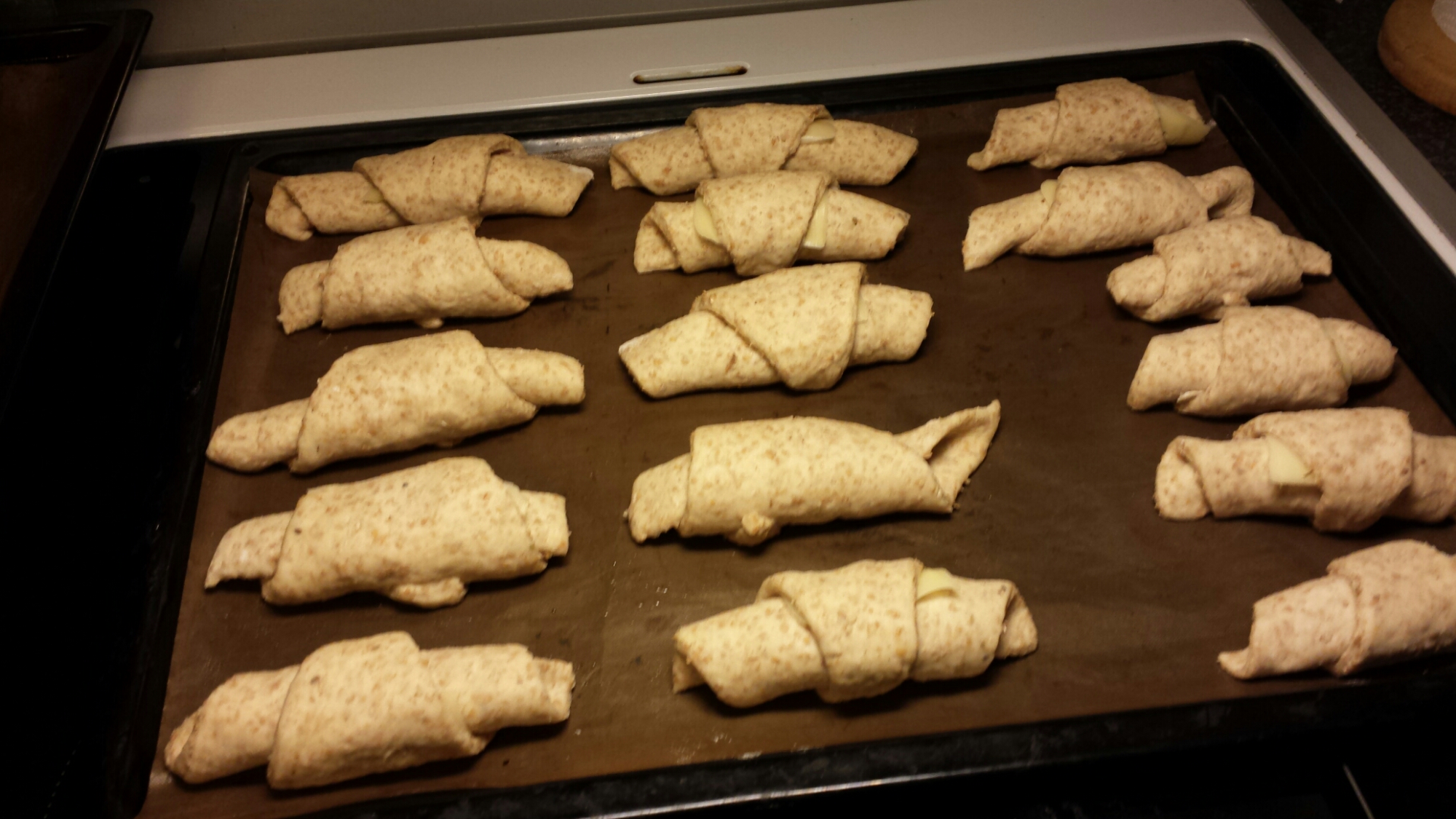 La stå å heve i 1 time. Lag horn med en skive ost og 1/4 skive skinke i hver. Stekes på 225 grader i ca. 12-15 minutter.