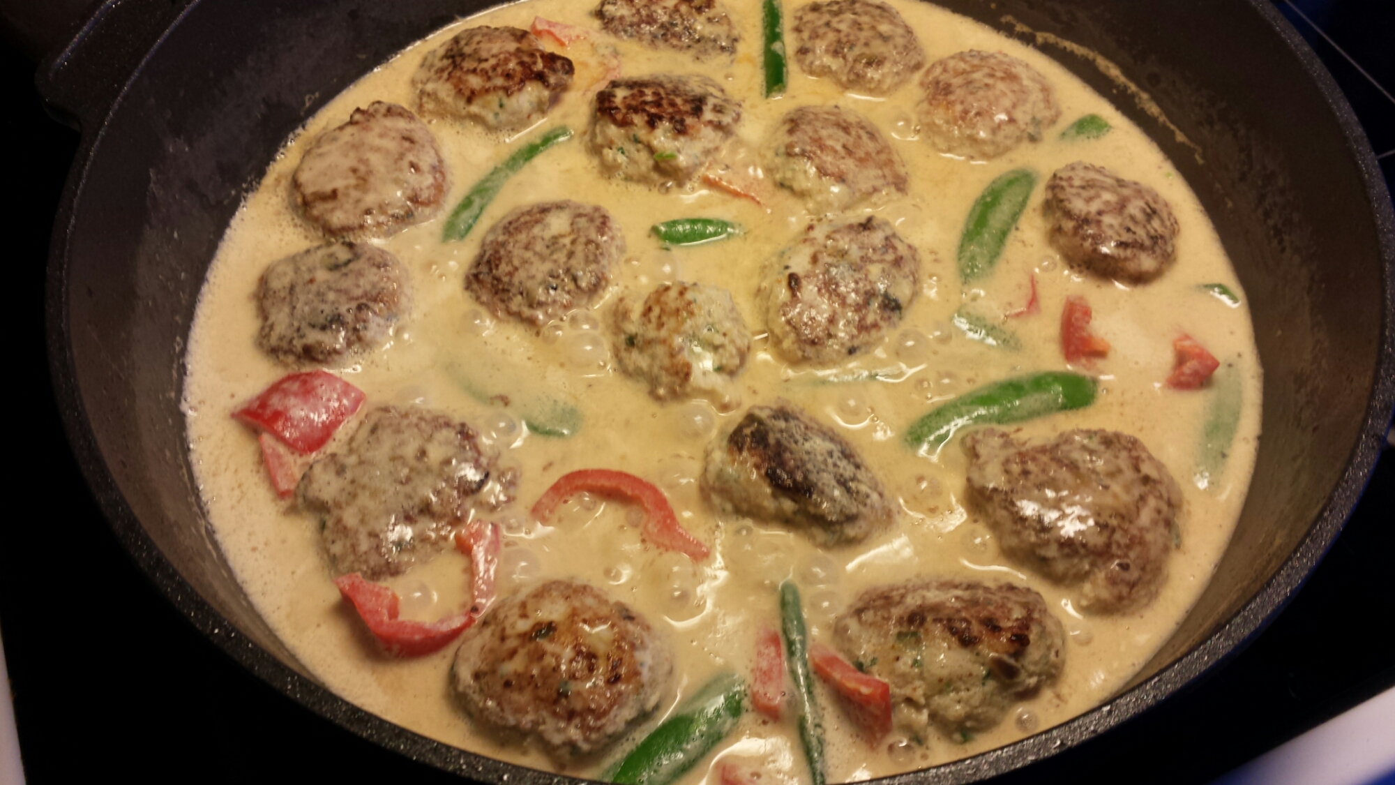Kjør alt i food prosessoren til en deig. Stek små kjøttboller. Ha over 1-2 ts thai red curry paste. Ha i det du har av grønnsaker. Jeg hadde sukkererter og paprika. Hell over en boks med kokosmelk og la koke i ca. 10 min. Voila!