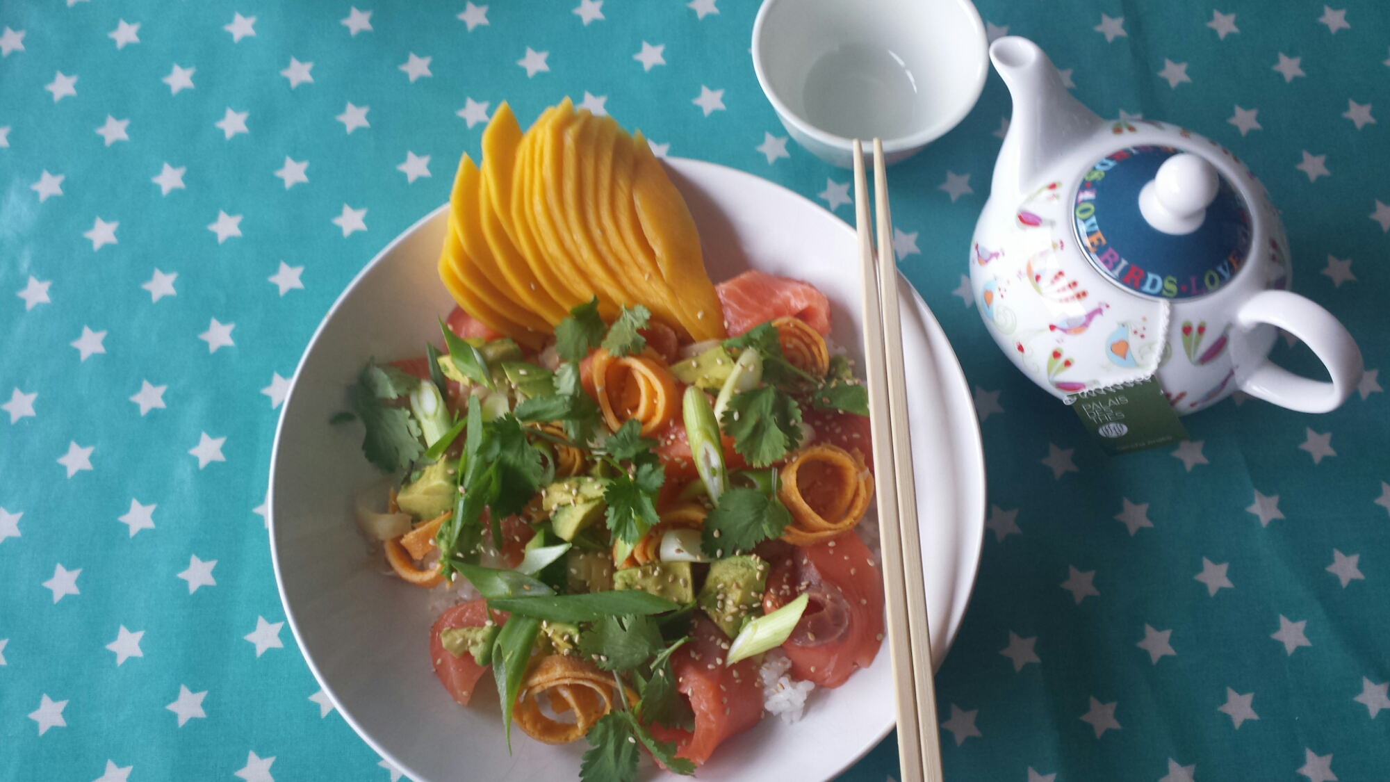 Du trenger ca. 150-200 gram laks til hver person. Skjæres i ca. 1/2 tykke skiver. Kok sushiris nok til antall personer du skal servere til – dynk med sushieddik, bland godt og la stå til du skal legge opp salaten. Stek en tynn omelett av to egg, tilsatt 1/2 ts. sukker og 1/2 ts. salt. Skjær i strimler. Skjær avokado, mango og vårløk i strimler/biter. Skjær syltet ingefær, ca. en teskje til hver, i strimler.