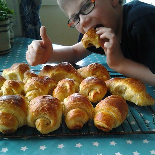 Nå har jeg endelig fått prøvd meg på å bake croissanter – tok fem timer (med mye ventetid), men det gikk veldig bra! Bare spør min anerkjente førstesmaker Nikolai – han var meget fornøyd!