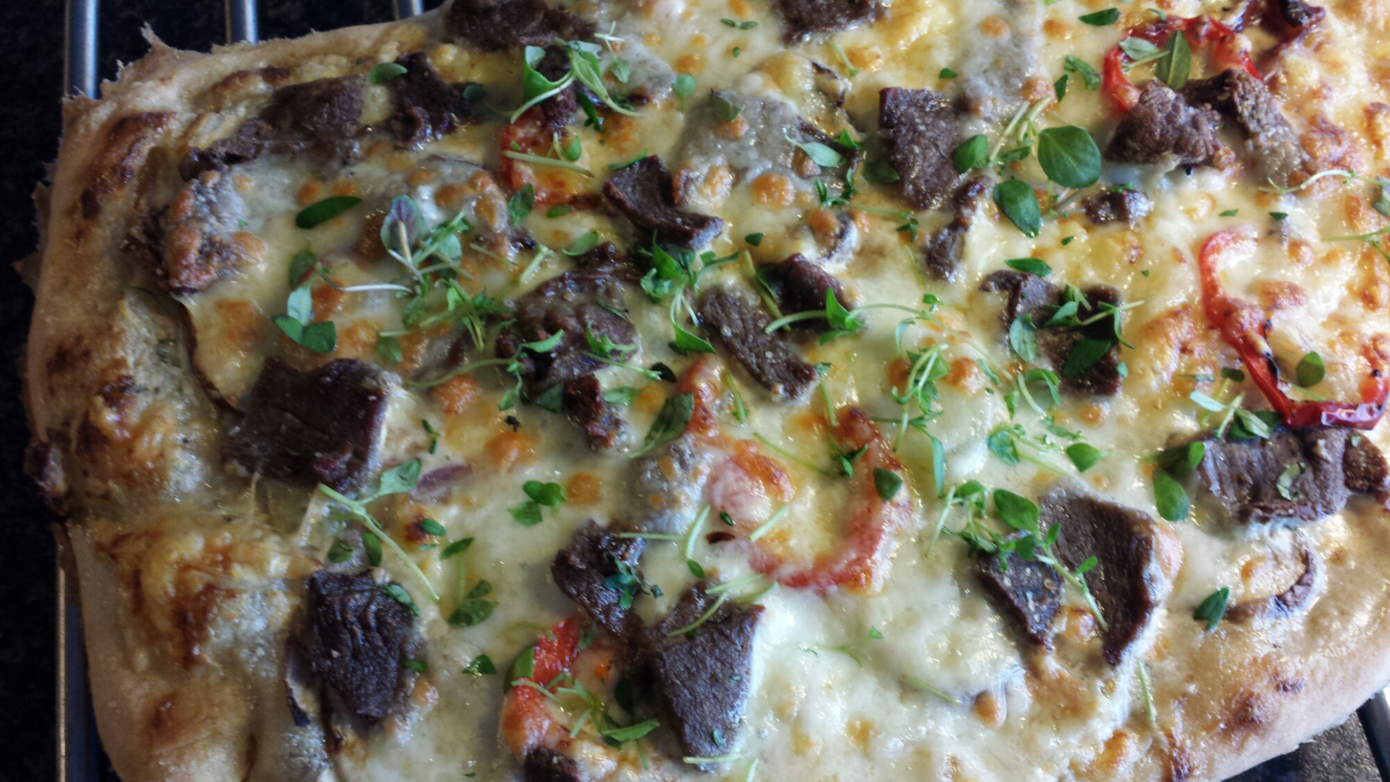 Ha på stekt bacon, rødløk, paprika og aromasopp – ha deretter på hvitost, legg tynne skiver finnbiff (rå, men tint) og litt fersk mozzarella på toppen. Når pizzaen er ferdigstekt har du på litt mer hakket fersk timian.