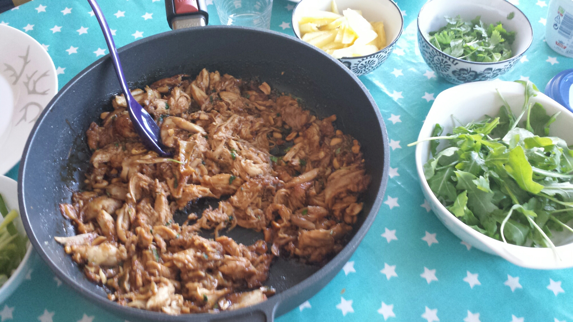 Så enkelt og så godt – hvis du blander sausen og river opp kyllingkjøttet kvelden før har du middagen klar på 5 minutter, hvis ikke så er den ferdig på 15! Da er det ingen grunn til å servere ungene boller til middag, som jeg har lest at enkelte i tidsklemma gjør:-)