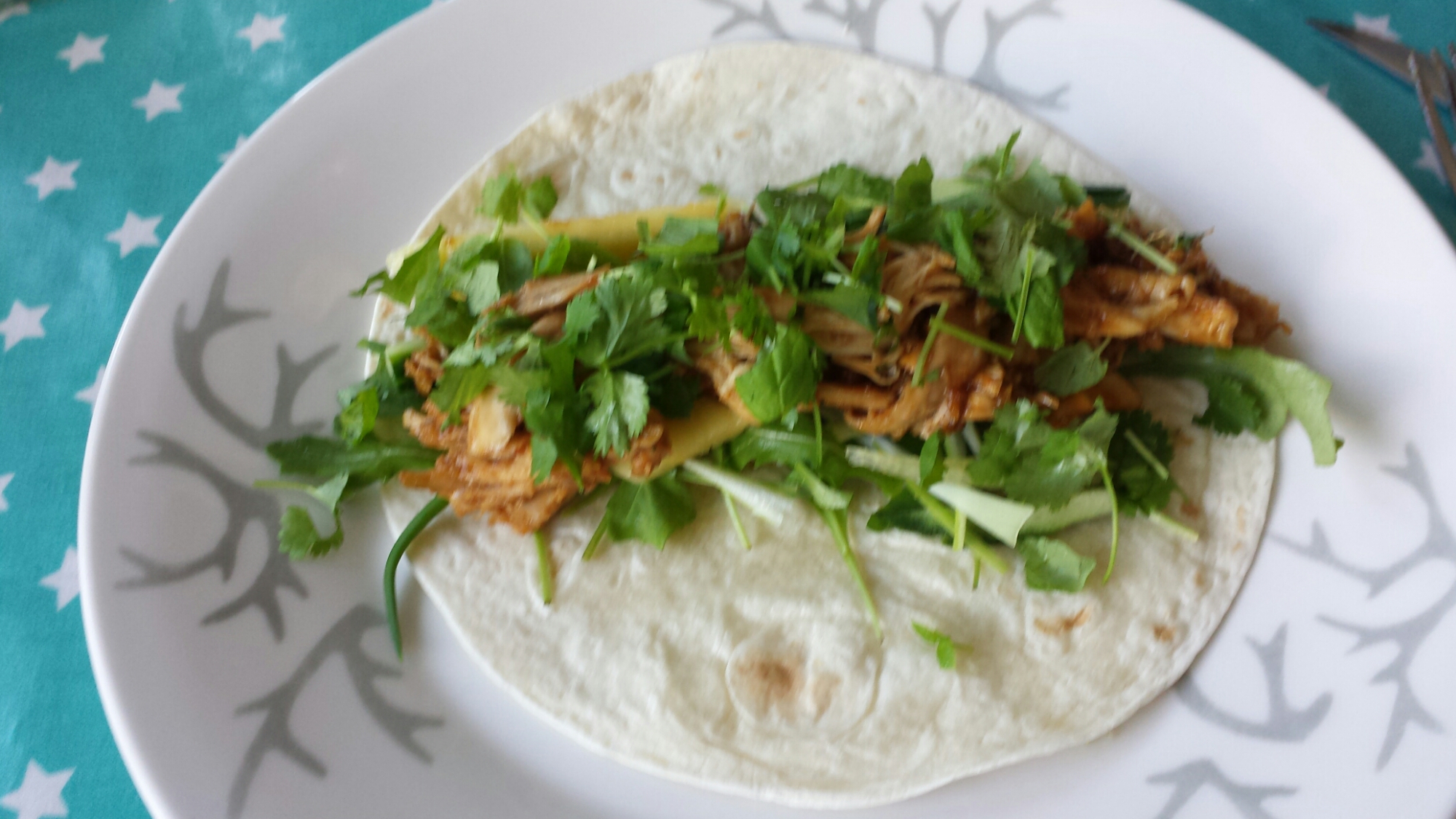 Riv kyllingkjøttet i biter med fingrene, ha den i en panne sammen med sausen og varm blandingen. Varm tortillaene i ovnen og skjær opp grønnsakene. Spis og kos dere!