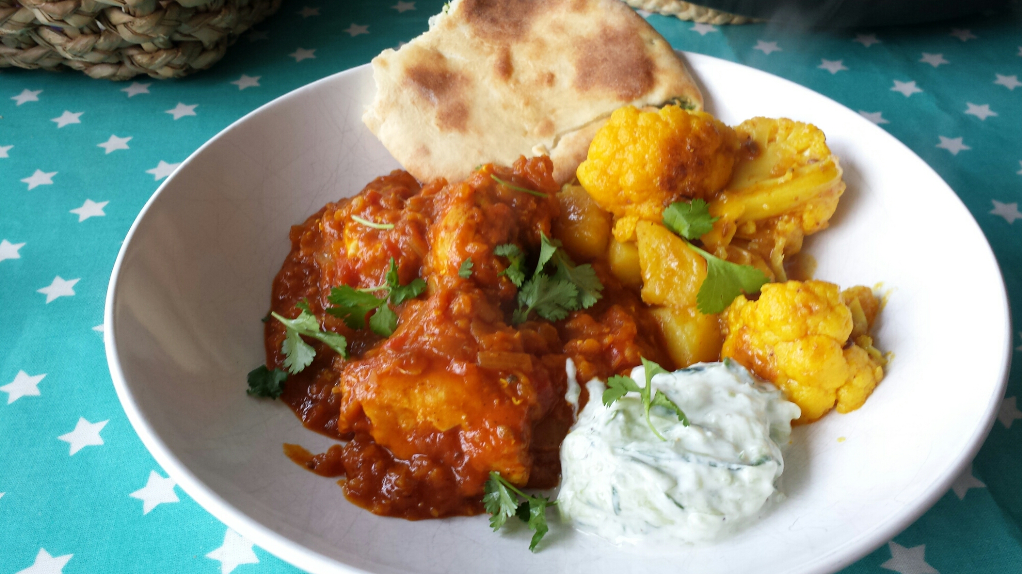 I dag har jeg laget søndagsmiddag med indiske toner – litt hete innendørs, siden det er så kaldt ute. To ulike typer curry – en med kylling og røde linser, og en grønnsakscurry med poteter og blomkål, servert med nybakte naanbrød og mynteraita.