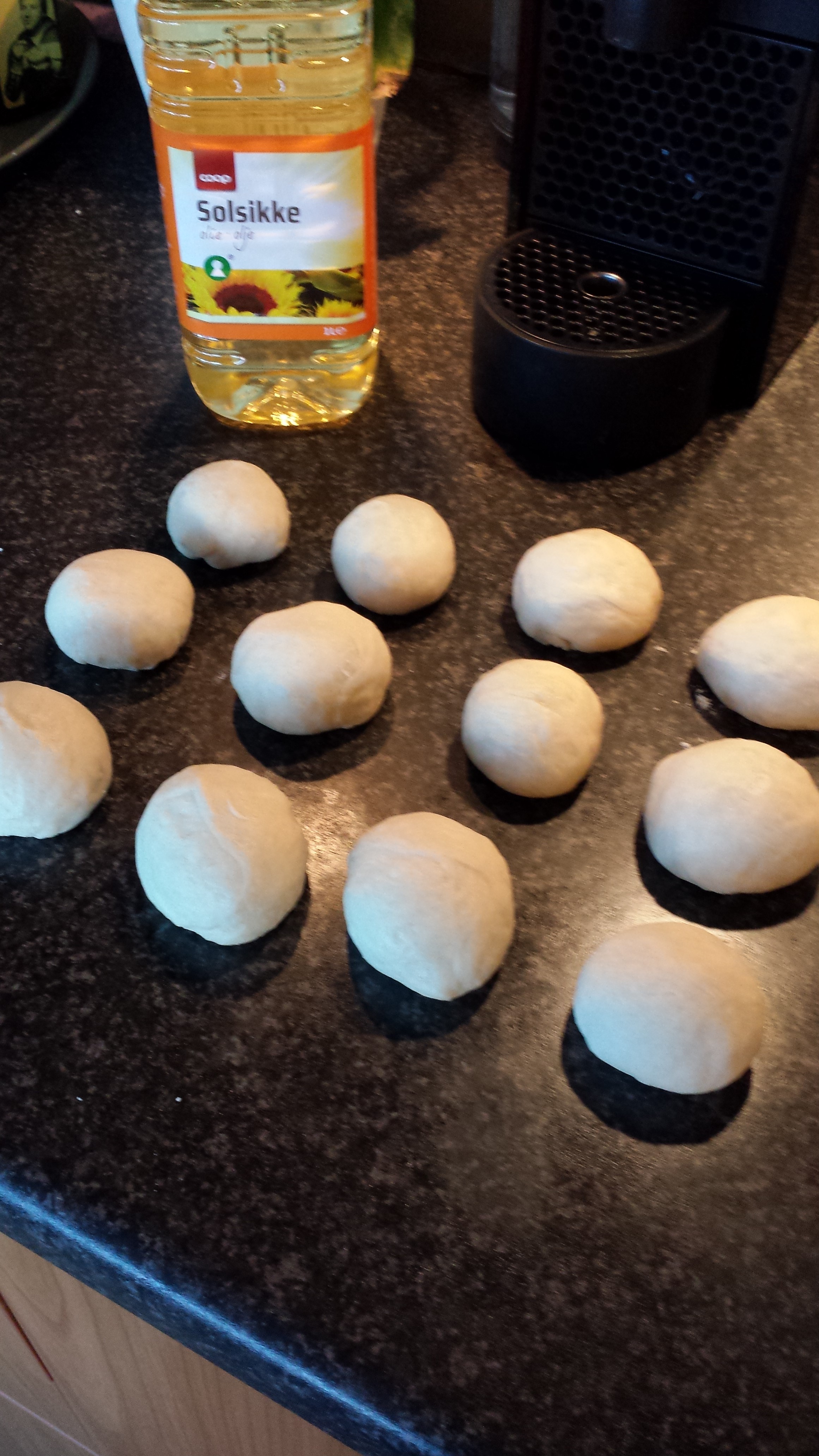 Visp sammen vann, gjær og sukker og la stå til du ser at gjæren begynner å boble. Ha så over de tørre ingrediensene og kna godt sammen til en glatt og smidig deig. Ha litt olje rundt deigen, ha over plastfolie eller lokk og sett til heving ca. 2 timer. Kna sammen deigen og del den i 12 biter – trill runde boller og legg til heving under plastfolie på benken ca. 45. minutter til. Klipp ut 12 små firkanter ca. 10X10 cm av mat- eller bakepapir til å legge bollene på. Klem bollen litt flat med hendene til du får en avlang leiv på ca. 10 cm i diameter.