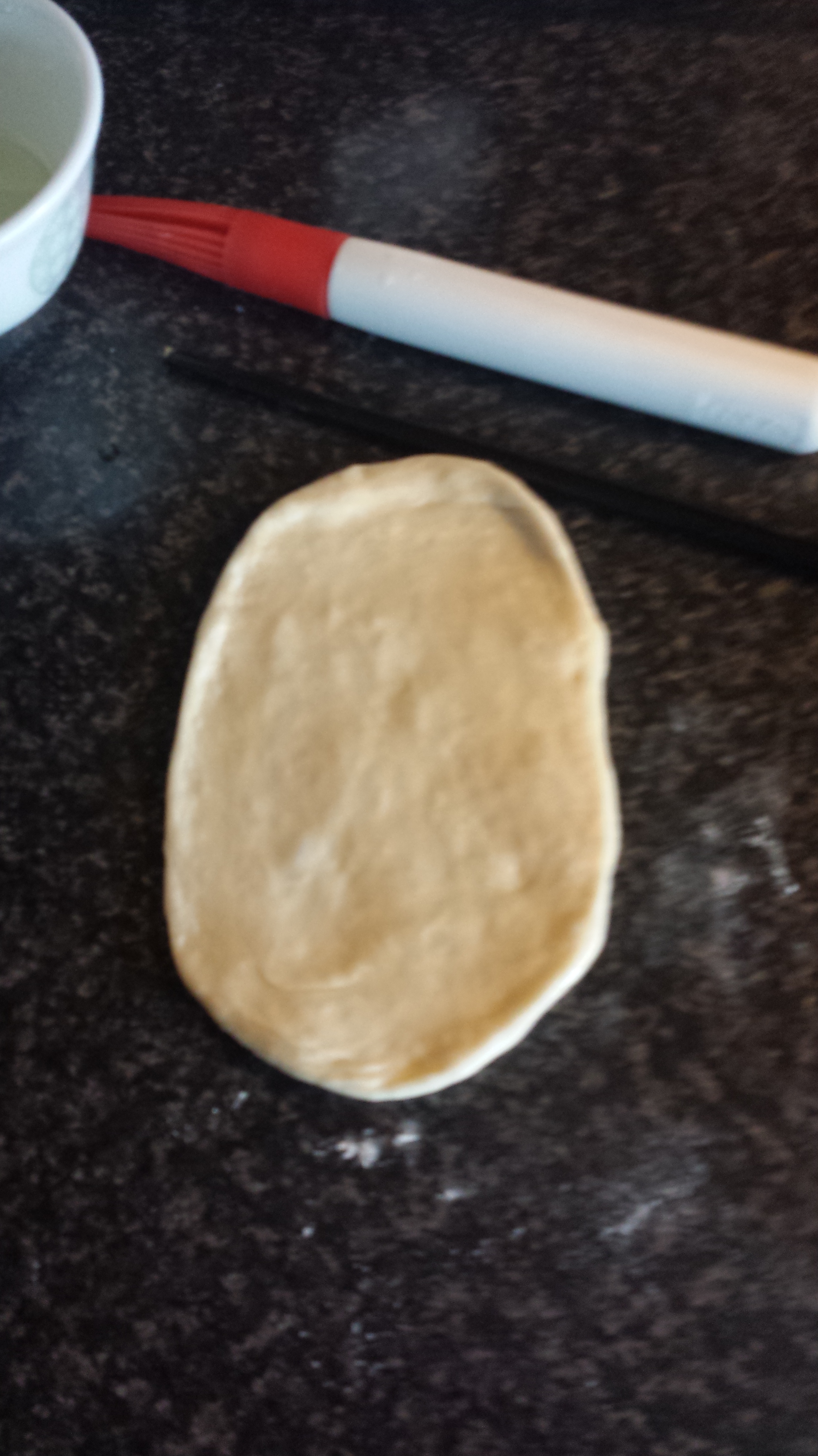 Legg leiven på benken og bruk en oljet spisepinne eller lignende til å kjevle hvis det trengs, pensle på olje. Legg spisepinnen midt på leien og brett den ene siden over den andre. Trekk spisepinnen forsiktig ut og legg leiven på et lite bakepapir – ikke klem på brødet etter at du har gjort dette. Legg alle under plastfolie etter hvert. La hvile i ca 15. minutter.
