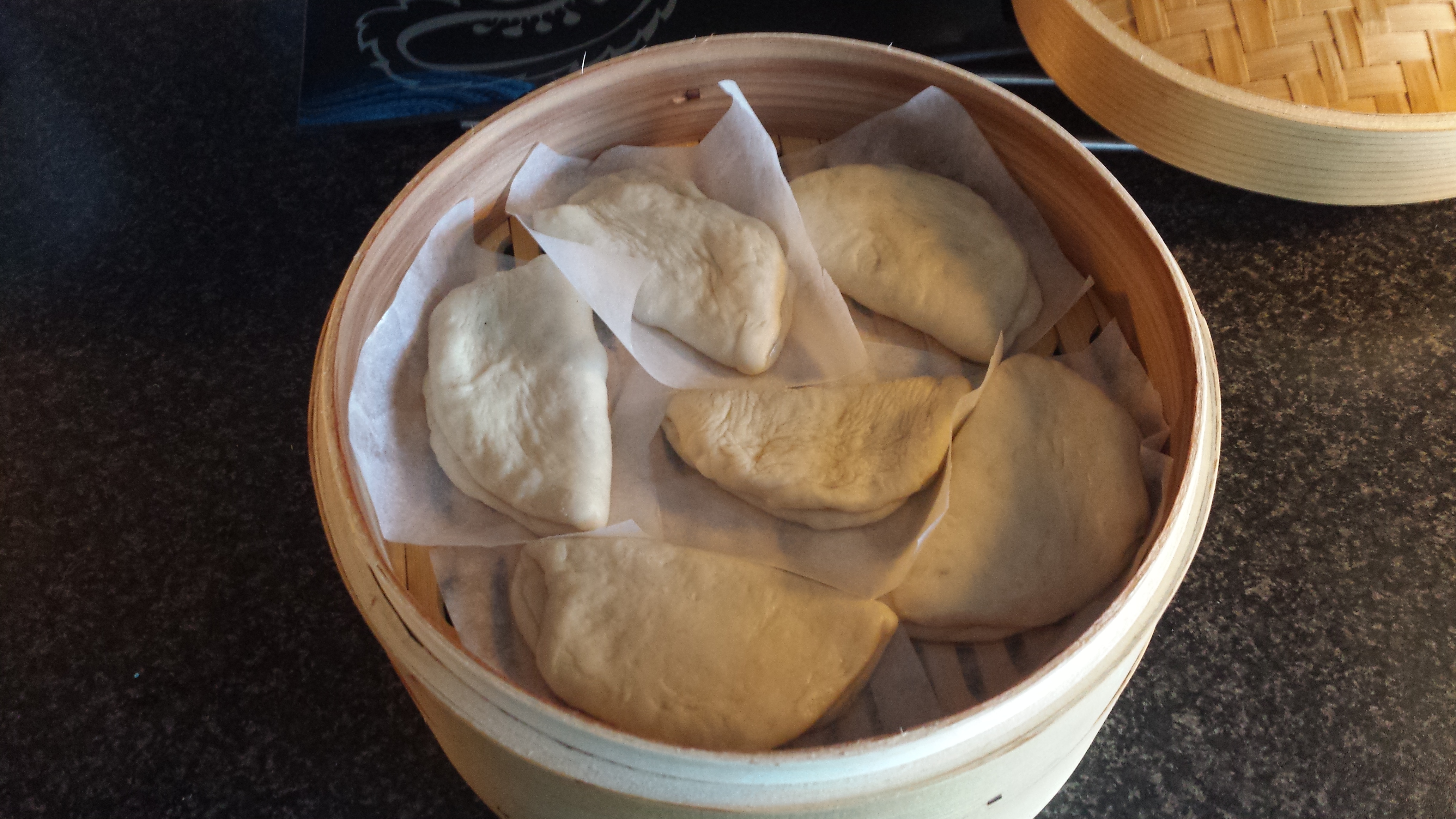 Varm opp vann i en wok – ha over bambussteameren – med bollene i. Jeg fikk plass til alle tolv i min steamer som har to etasjer. Damp bollene i ca 4-5 minutter.