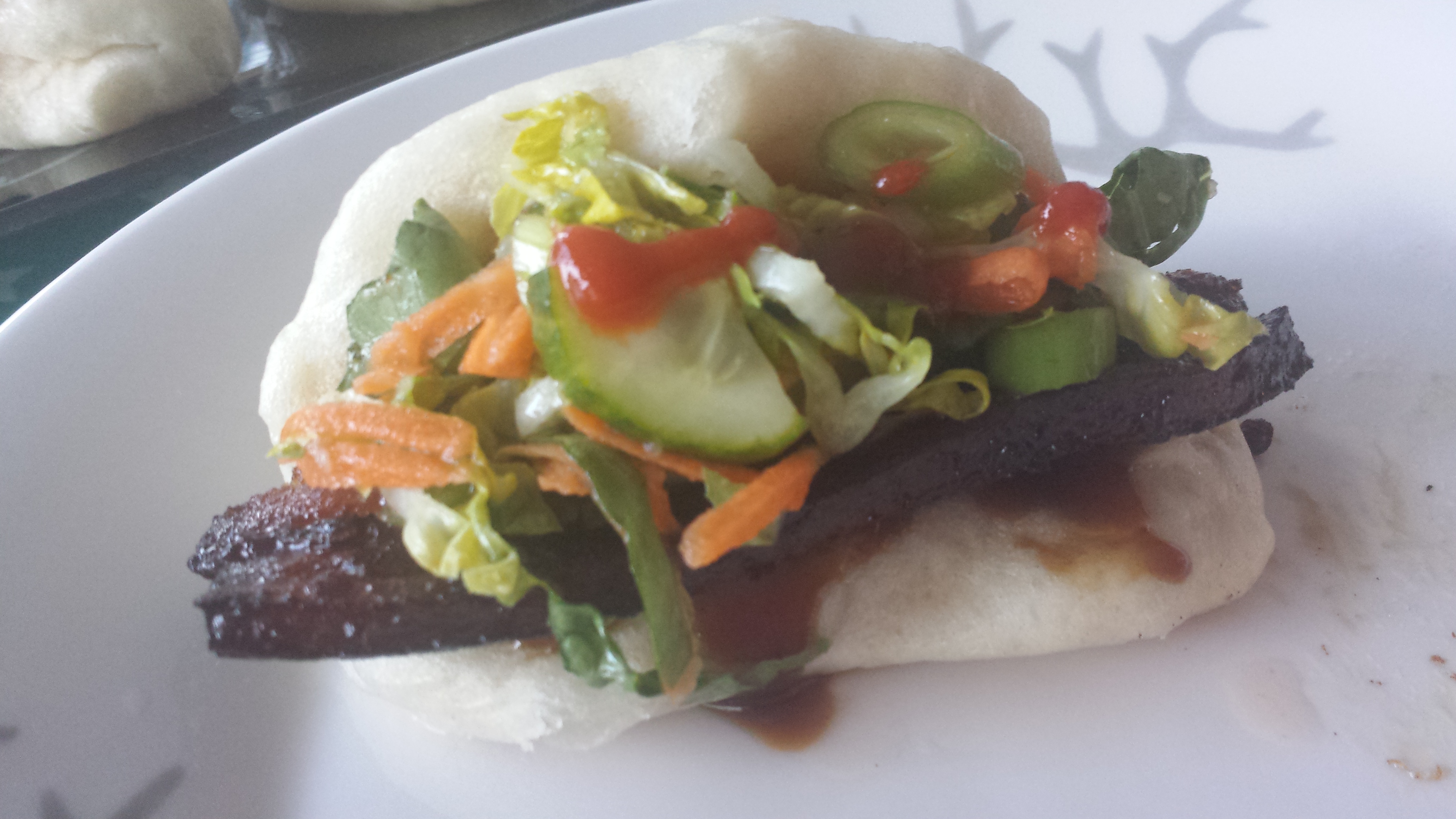 Da fikk jeg endelig prøvd meg på å lage steam buns! Steam buns er dampede boller som man kan fylle med det man ønsker – ofte fylles de med marinert ribbe eller for eksempel andekjøtt (det man har lyst til – på Hildr i Tromsø serverer de dem med nydelig stekt tørrfisk) og diverse grønnsaker. Gjerne en syrlig salat som den jeg har laget i dag. Disse bollene finner man som gatemat mange steder i Asia – og de er blitt veldig populære også her i landet – nå som det går en gatematbølge over landet …
