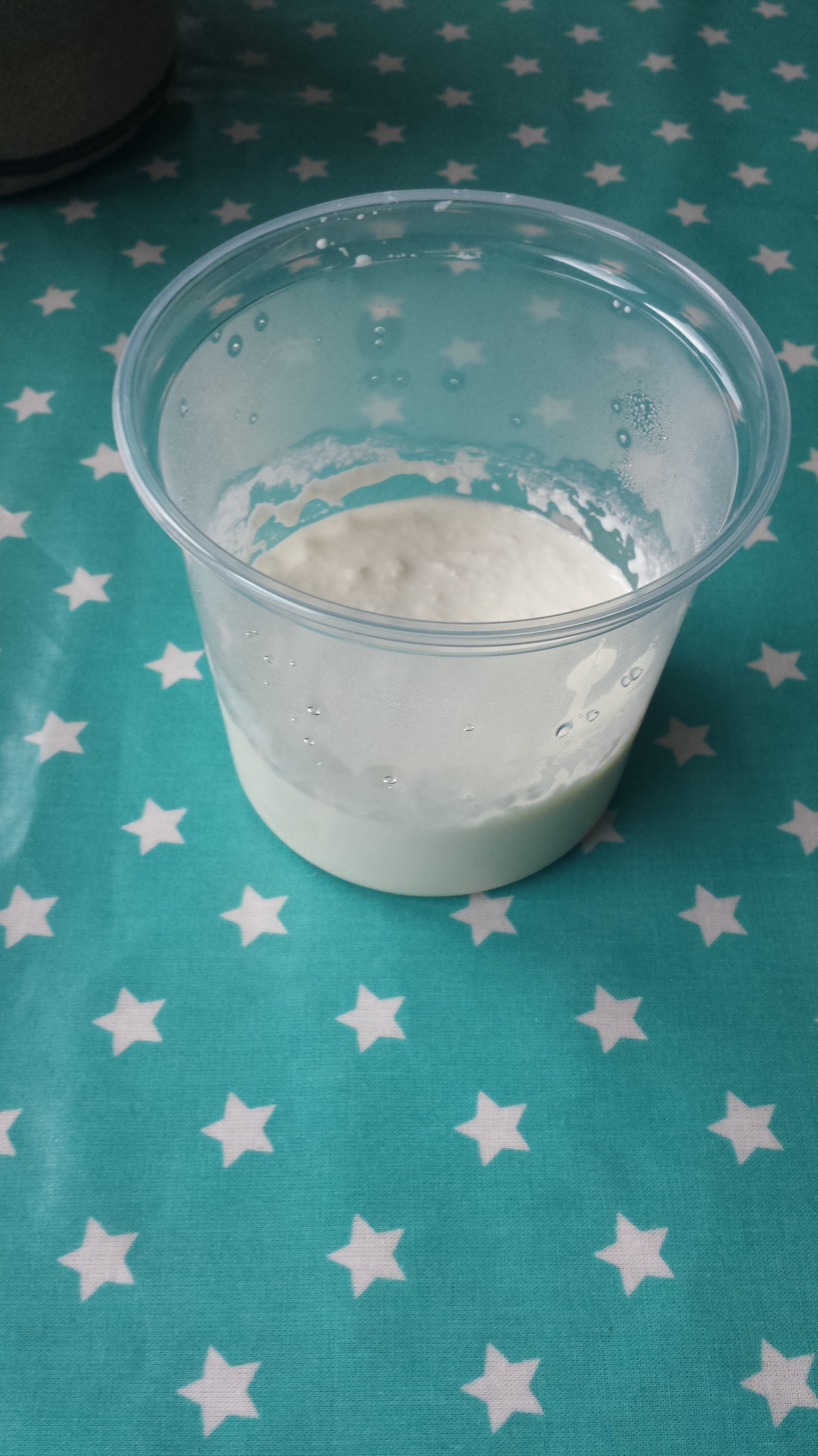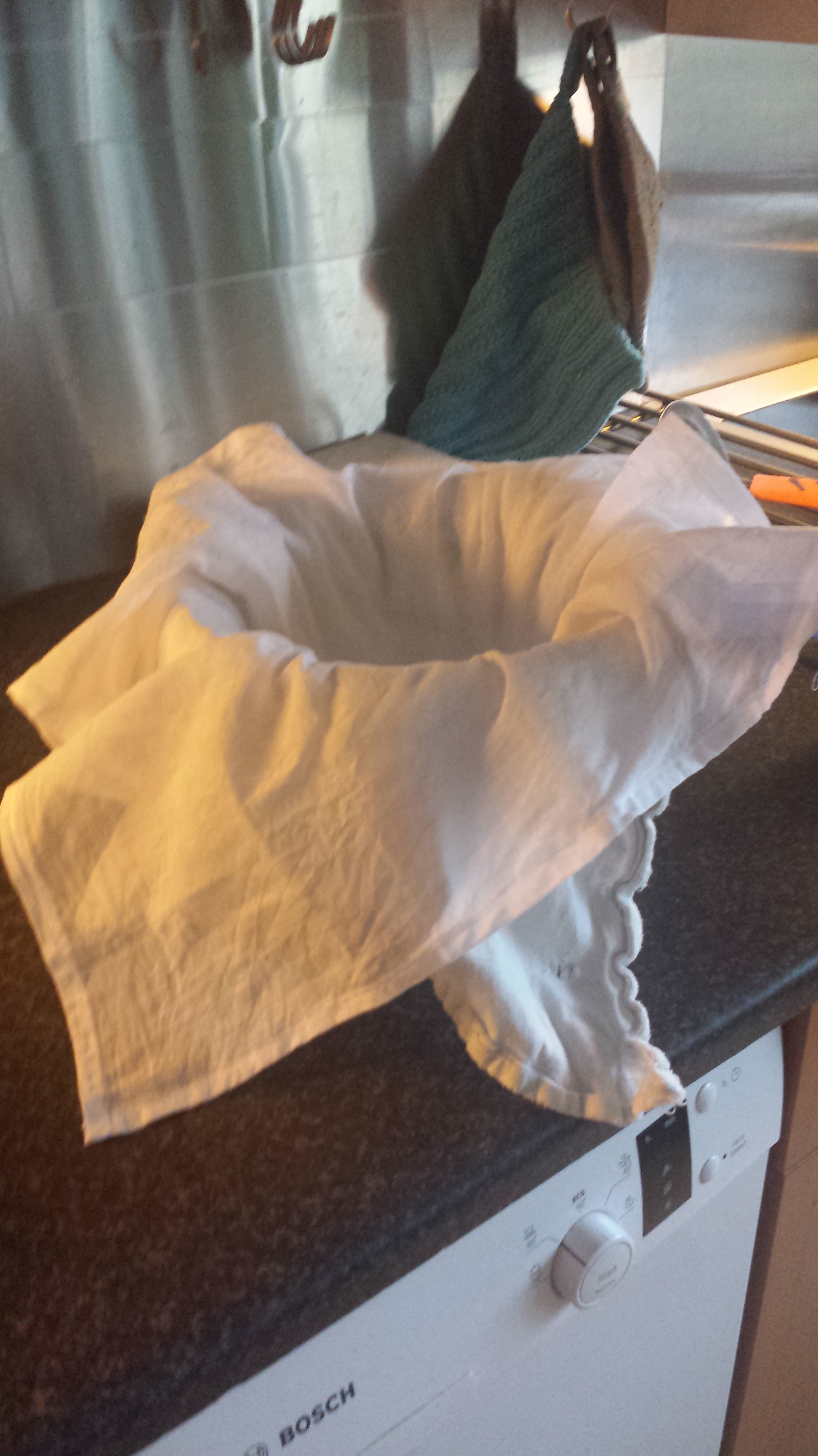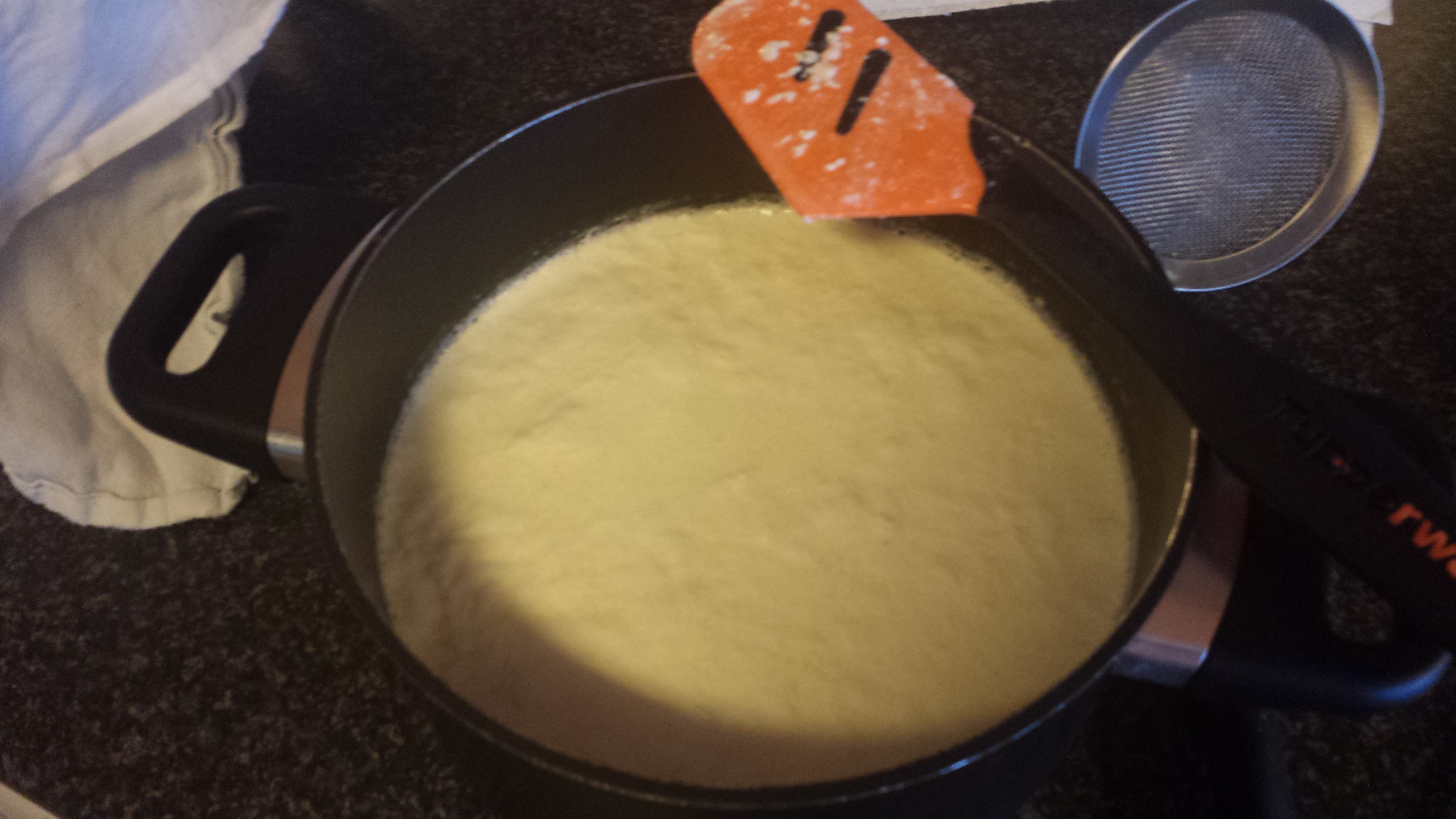 Varm opp melkeblandingen til tett oppunder kokepunktet til du ser at den begynner å skille seg, avkjøl litt og sett til henging som beskrevet over.