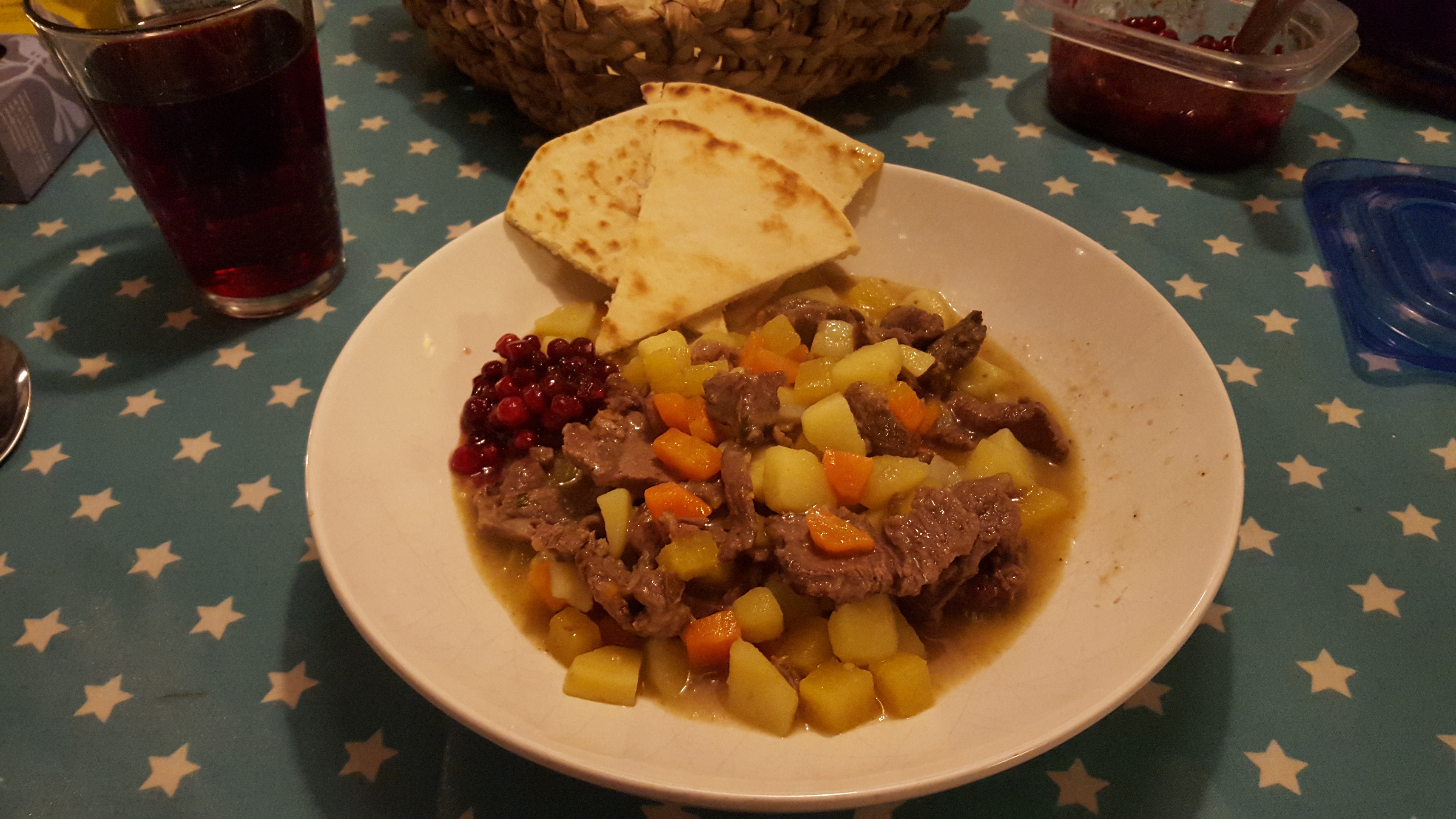 Vend kjøttet som er skåret i grytebiter i mel iblandet salt og pepper. Brun kjøttet og hell på vann til det dekker kjøttet. La småkoke ca. 30 minutter. Ha i gulrøtter og kålrot i biter. La koke i ca. 15 minutter. Ha deretter i potetene og kok til de er møre. Smak til med salt og pepper. Du ser selv hvor mye væske du har i, jeg liker at gryta er litt tykk, men den kan også være mer flytende, som en suppe. Snak til med salt og pepper. Server med flatbrød eller brød, og tyttebærsyltetøy.