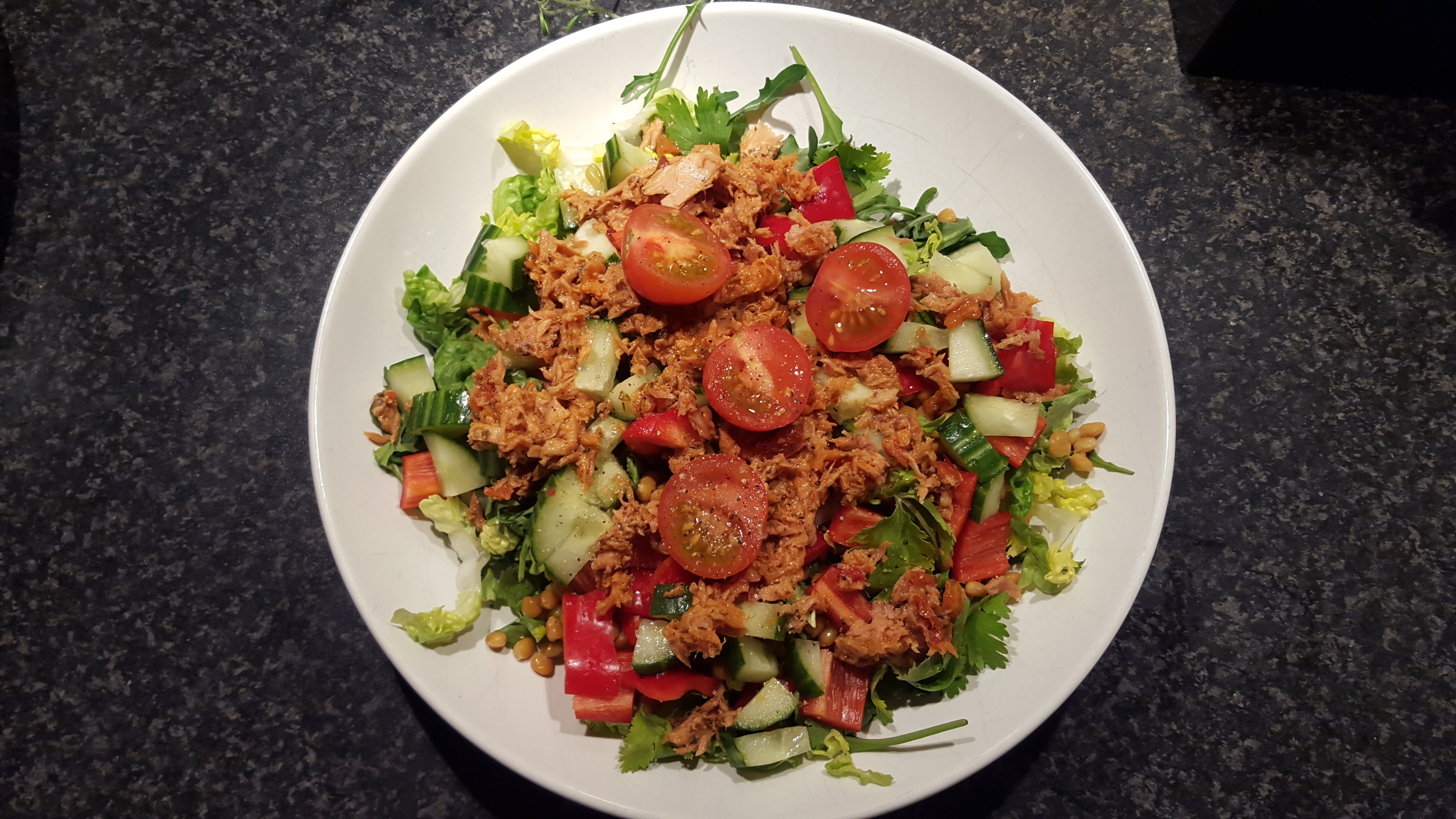 En porsjon (308 kcal) Skjær opp og bland alle ingrediensene, enkelt og greit. Jeg bruker tunfiskboksene fra King Oscar – de fins i tre ulike smaker: Tunfisk med soya og ingefær, med tomat og basilikum, eller hot thai chili. En boks a 85 gram til en porsjon. Her kan man variere som man vil, bytte ut linsene med kidneybønner eller kikerter og ha i andre grønnsaker. Jeg tror også det er bra med en halv avokado.