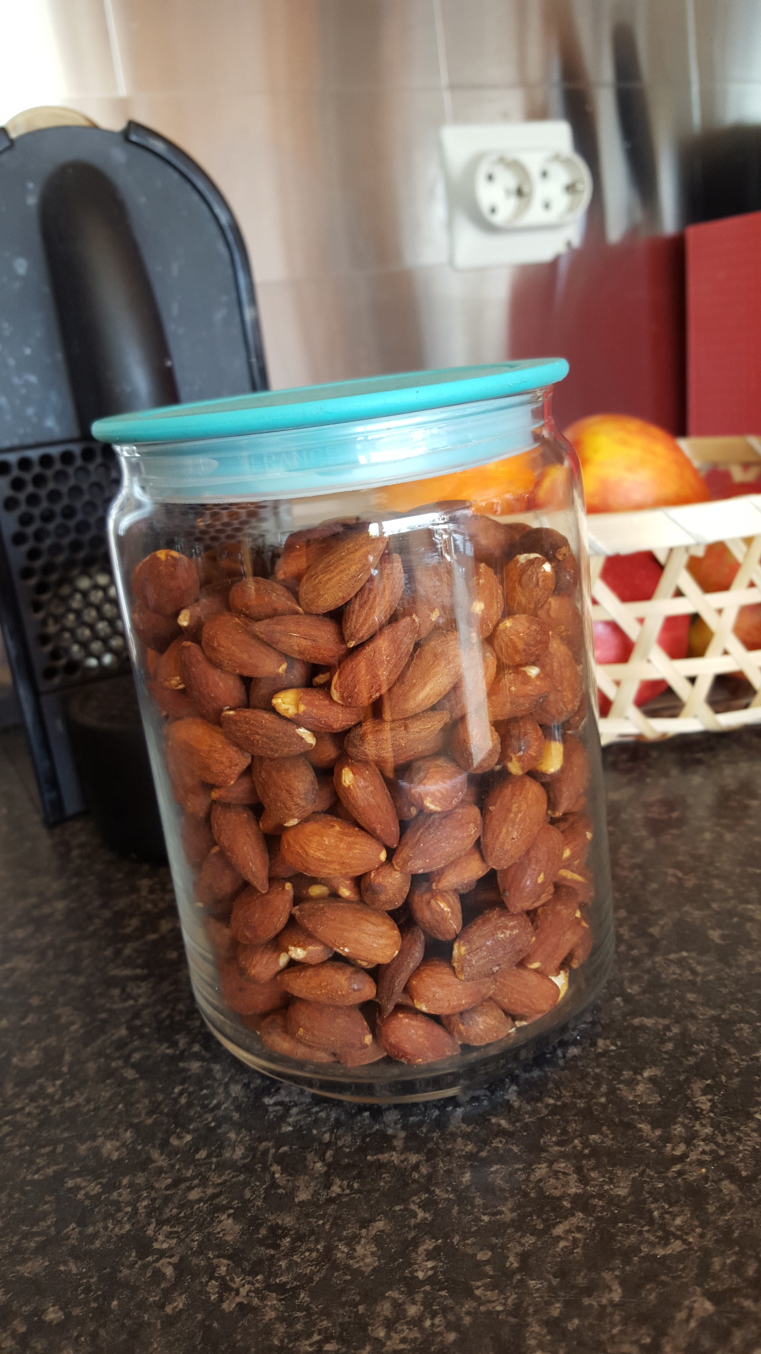 Varm ovnen til 180 grader. Ha nøttene på et stekebrett og ta over litt vann, bland med hendene sånn at nøttene blir litt fuktige. Rist nøttene i ca 15 minutter, rør om eller rist på brettet så nøttene snur seg et par ganger. pass på så de ikke brennes. Ta ut fra ovnen og ha over ca 3 ss med soyasaus, rør rundt mens soyasausen fester seg på nøttene. Det skal ikke bli vått, all fuktighet skal fordampe bort.