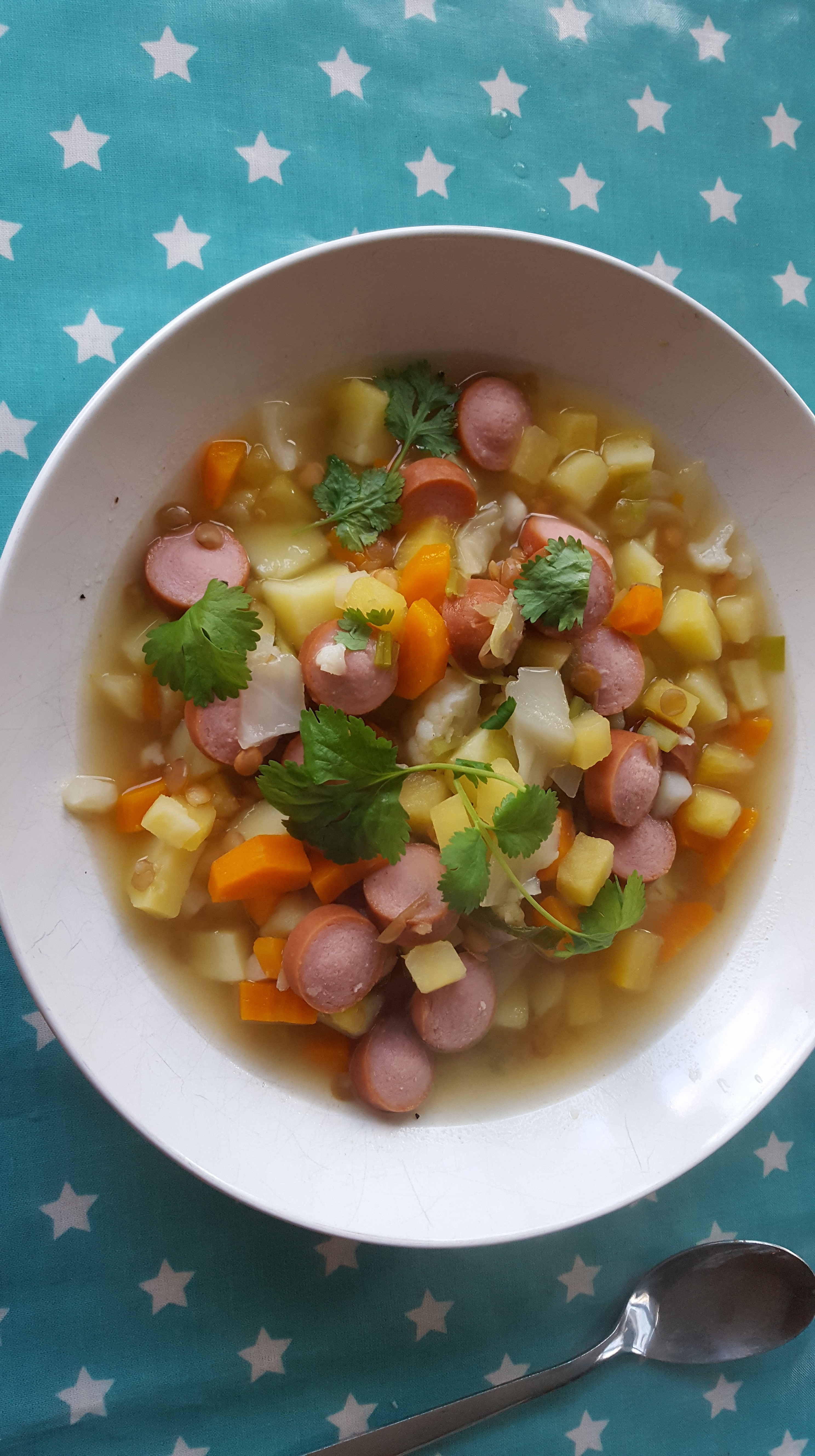 Kok opp buljongen med de hardeste grønnsakene i først, kok ca 10 minutter og tilsett så poteter og la koke ti-femten minutter til, til grønnsakene er nesten ferdigkokt. Tilsett så blomkål, ferdigkokte hermetiske linser og pølser og kok fem minutter til alt er gjennomvarmt.