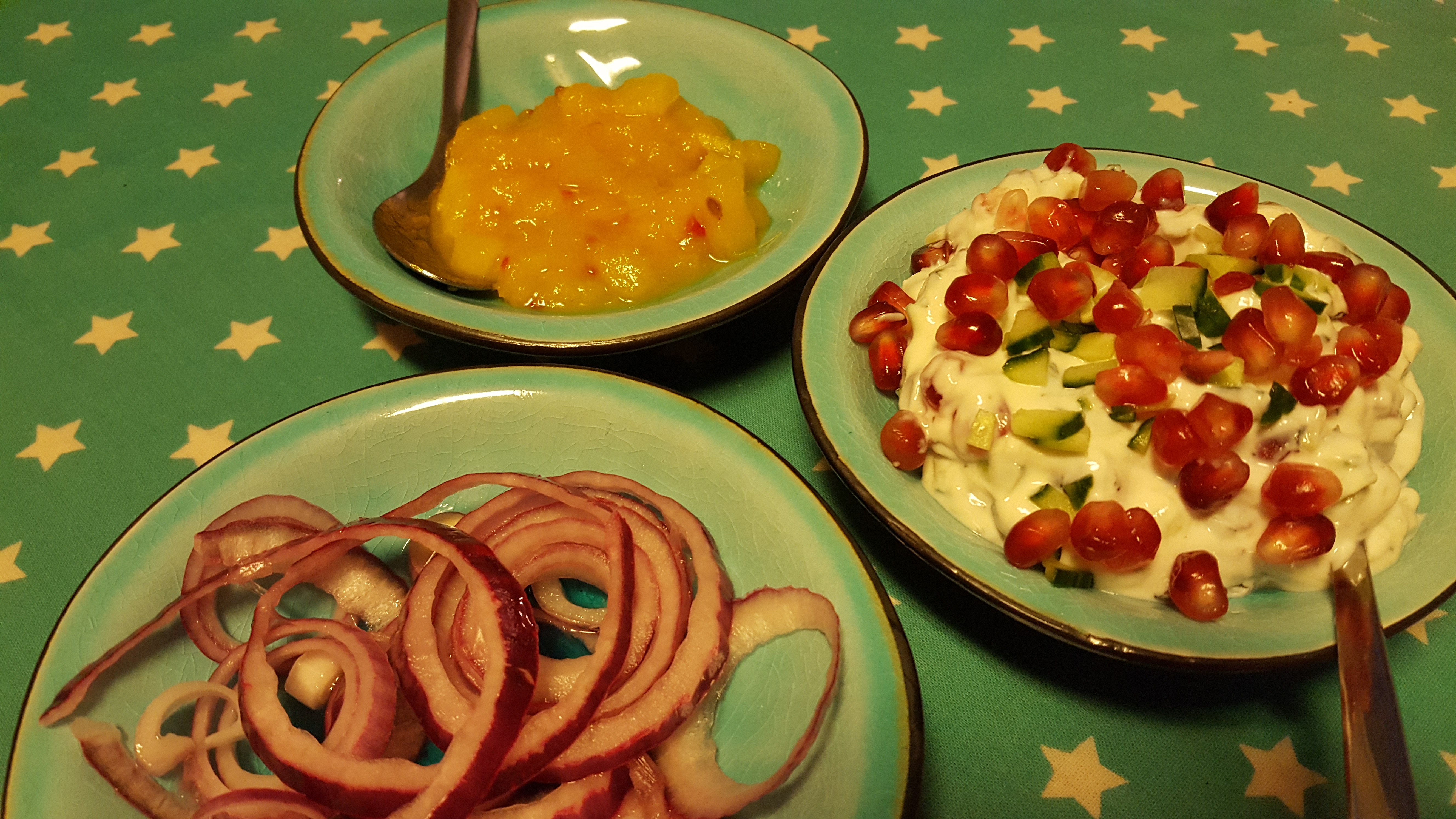 Annet tilbehør kan f.eks være ringer av rødløk som har stått og trekket litt med sitronsaft på (løken blir veldig god og mild av det), mangochutney og en raita av naturell yoghurt (gjerne en tykkere gresk/tyrkisk type), agurk i små terninger, granateplefrø, litt malt spisskummin, fersk mynte, salt og pepper. Og naanbrød, selvfølgelig!