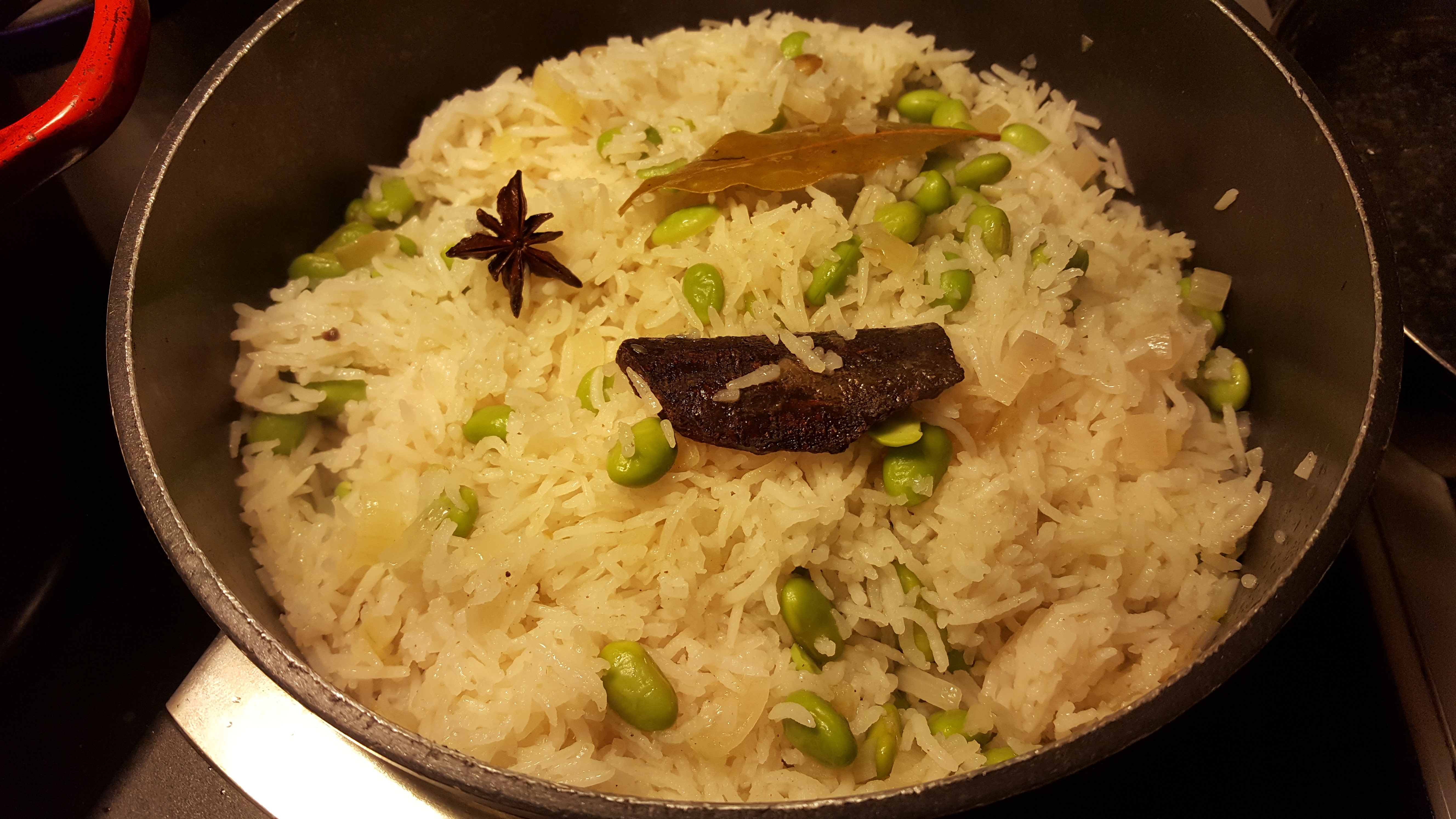 Varm opp 8 ss olje, tilsett en liten løk eller noen sjalottløk, 3 cm stor kanelstang, 1 åpnet kardemommekapsel, 1 stjerneanis og et laurbærblad. Fres til løken er mye og er lysebrun. Hell vannet risen har vært bløtlagt i oppi gryta og kok oppvannet før du har i risen, 100 gram edamamebønner (eller grønne erter), 1 ts garam masala og 1 ts salt. Kok på middels varme til alt vannet er borte. La så risen stå i 5-10 minutter med lokket på, rør forsiktig rundt med gaffel for å lufte risen litt.