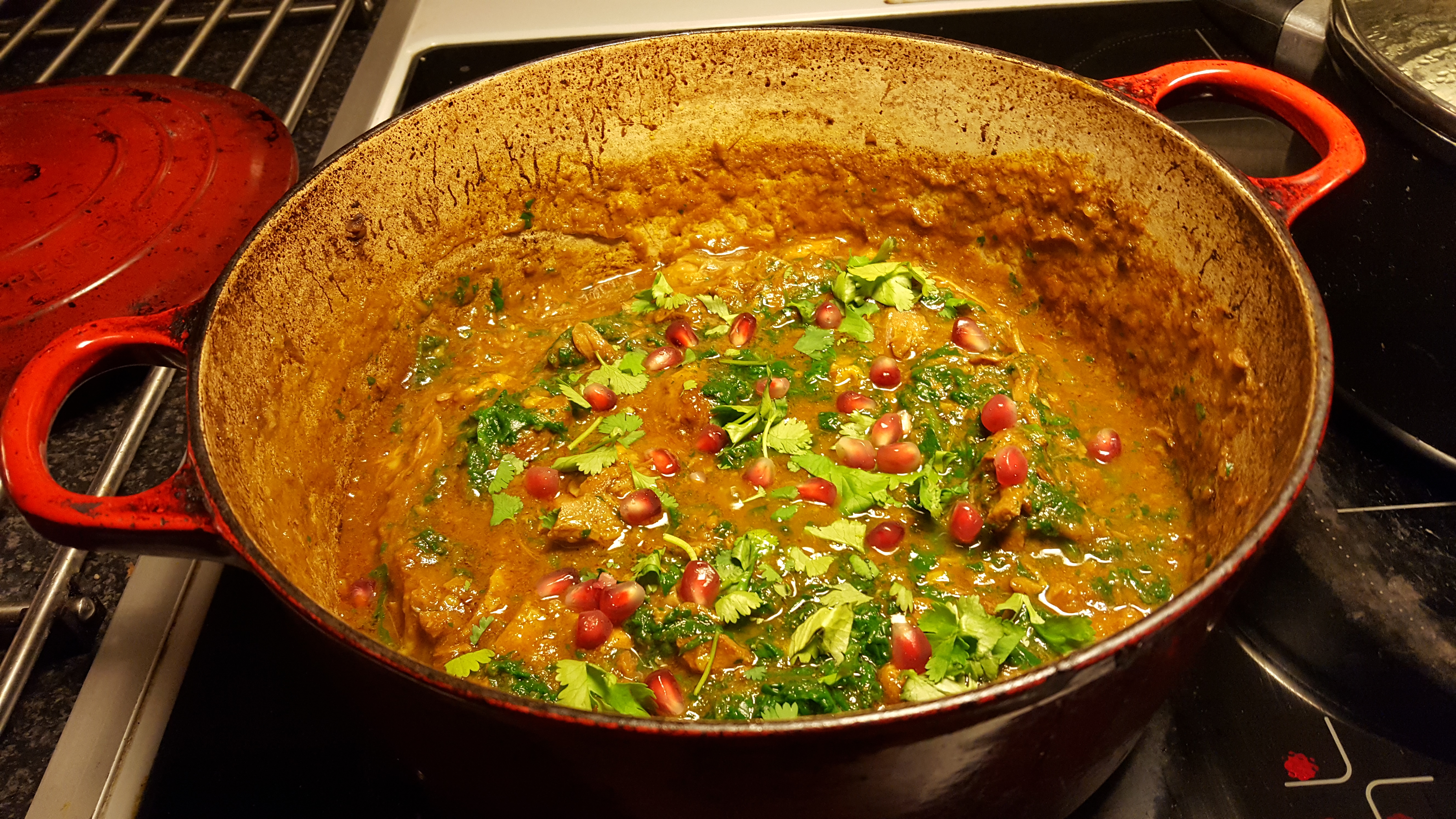 Varm så opp olje i gryta igjen og brun kjøttbitene, ha over det tørre krydderet, litt salt og løkpastaen. Ha over varmt vann til du har en fin saus og kok opp. Ha så gryta på en rist nederst i ovnen på 130 grader, og her kan den stå å godgjøre seg i timevis. Min sto i tre timer, da tok jeg den ut (fordi jeg trengte ovnen til å steke naanbrødene i). Satte da gryta på lav varme og lot den småkoke over en time til mens jeg laget til de andre ingrediensene. Rett før servering varmet jeg opp noen ss med vann i en kasserolle, hadde i spinaten og lot den falle sammen, før jeg kjørte den med stavmikser og hadde oppi gryta sammen med hakket koriander.