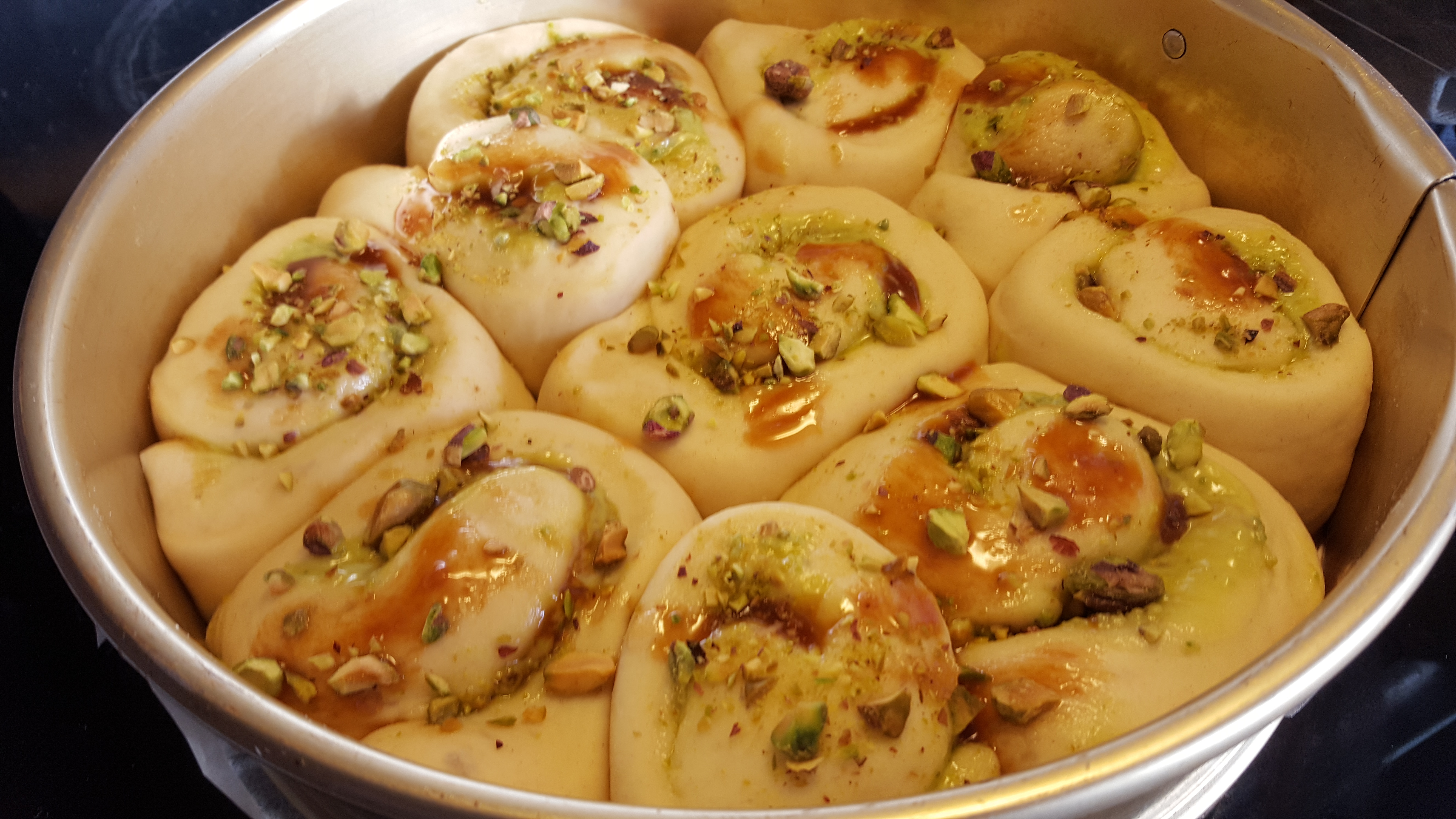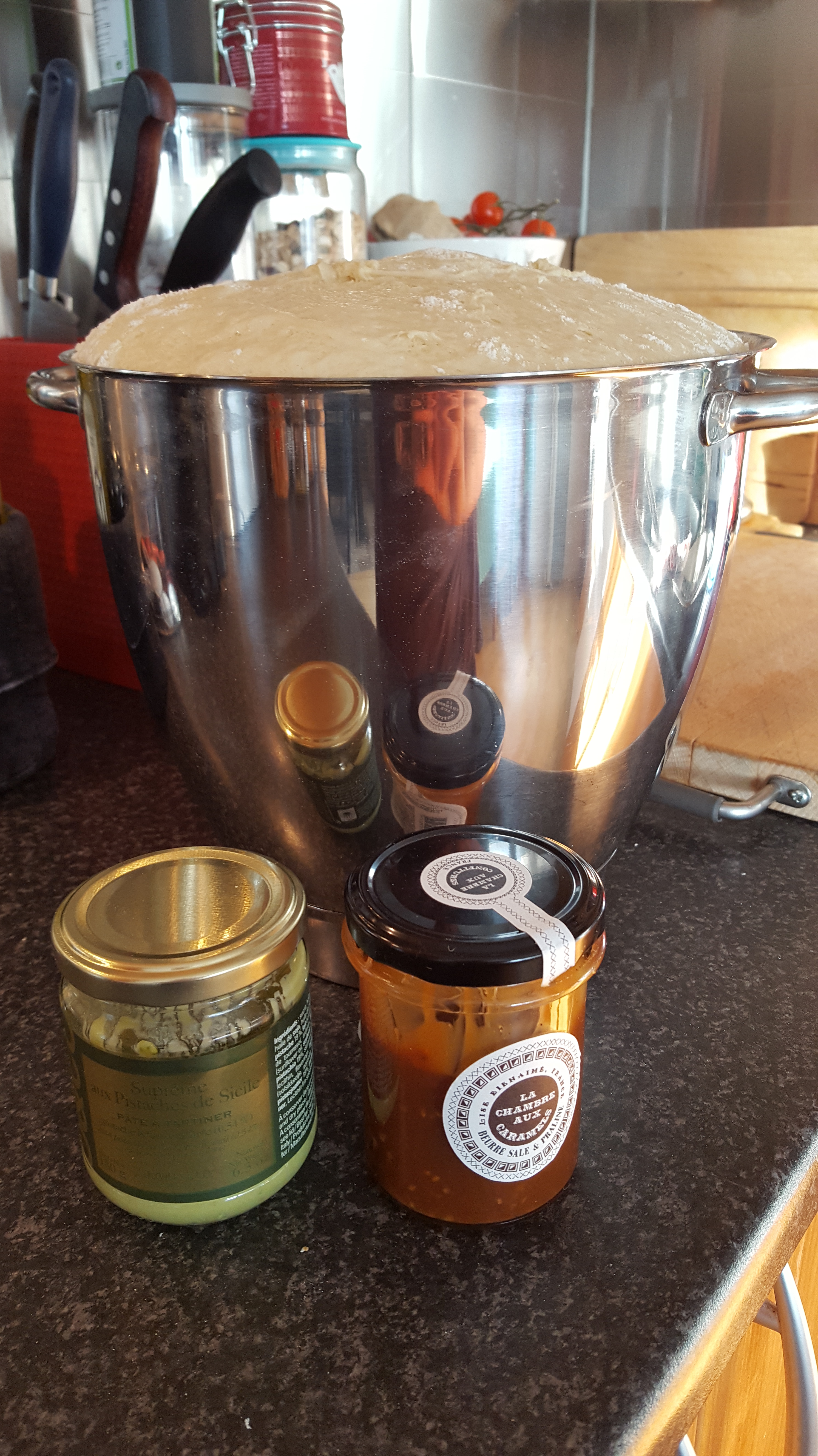 Ha det tørre i en kjøkkenmaskin, tilsett eggene og melka sakte når du har startet maskinen. Elt i ca. 10 minutter – ha så i smøret i terninger. Elt i 10 minutter til. Ha over lokk eller plast. La heve i ca. en time. Og bak ut til det du vil av søt bakst. Jeg lagde vanlige boller, kanelsnurrer (fyll laget av brunt sukker, smør og kanel)og en bollekake med salt karamell og pistasjkrem. For mye av det gode er heeerlig!
