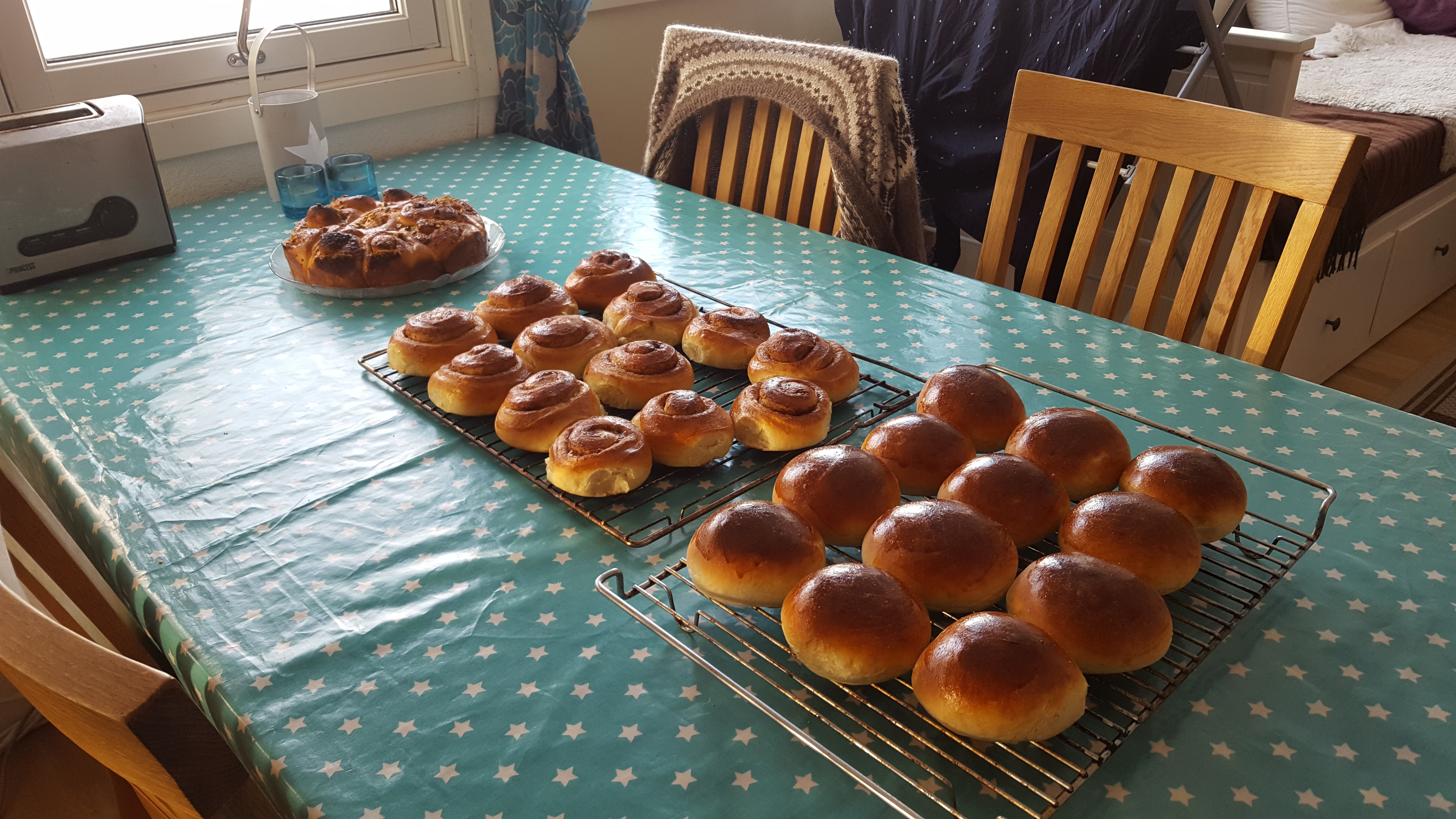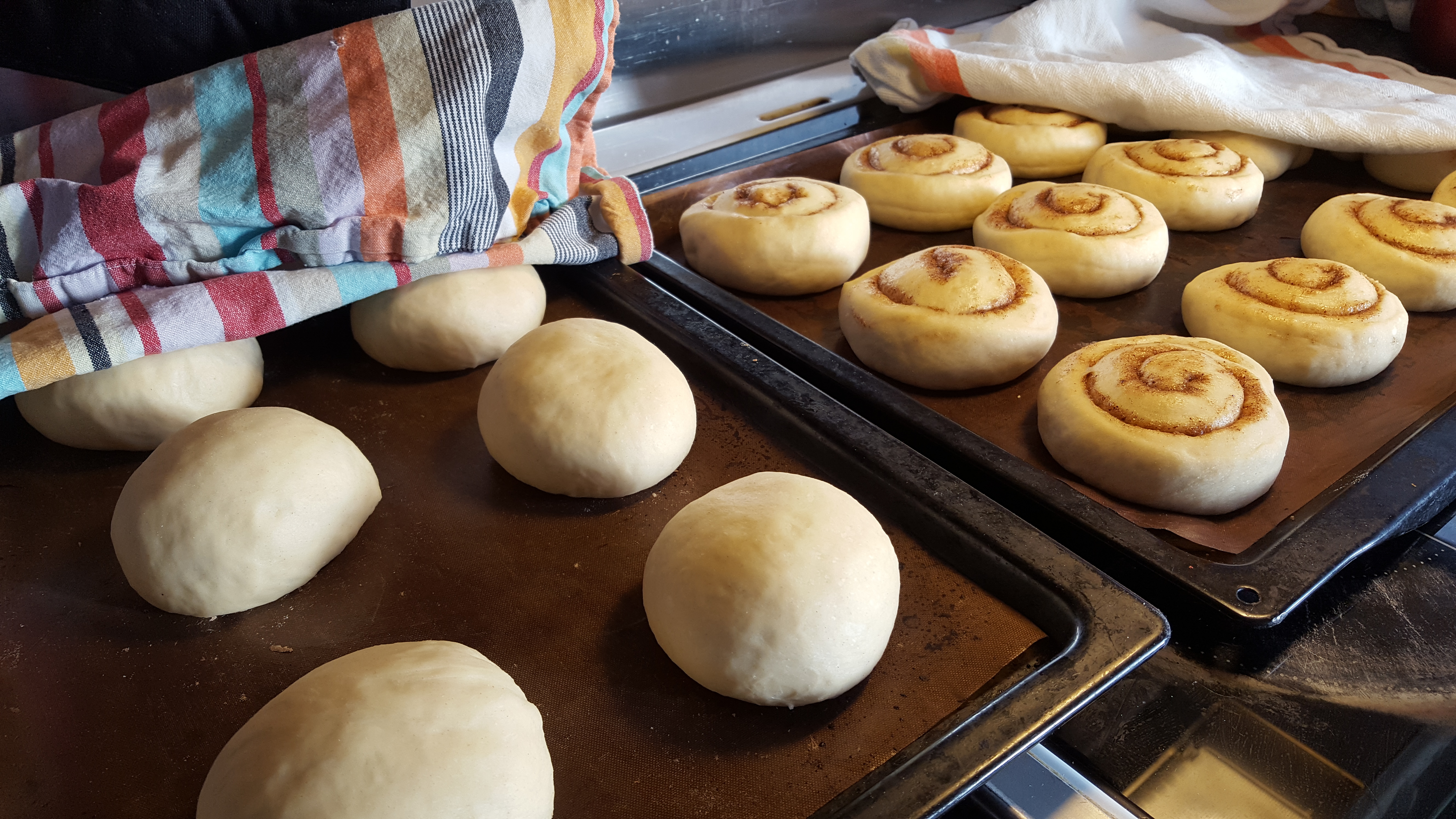 Tenkte jeg skulle kalle dagen i dag for bollebonanza og da kom jeg til å lure på hva det egentlig betyr. Så da gikk jeg til kilden. Store norske leksikon, på nett. Og da lærte jeg at bonanza er:» … spesielt rike malmpartier i en gruve. Betegnelsen er særlig brukt i USA.» Ok. Har veldig lite med boller å gjøre. Men i overført betydning brukes utsagnet ofte for å beskrive en rikdom, så der har vi koplingen. En rikdom av boller – det har vi hatt her på Knausen i dag – det er helt sikkert. Jeg lagde verdens beste boller i dag – tre forskjellige typer av samme deig. Deigen er laget på den måten vi har lært fra Schakenda – han med bakeriet i Lom . Ikke tilsett alt melet på en gang – la litt være tilbake og kjenn etter hvordan deigen blir, deigen blir ikke like bra hvis det blir for mye mel.
