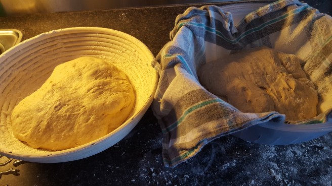 La deigen stå å hvile i en time – ha så over 20 gram salt og kna det godt inn. Strekk godt på deigen. Nå skal du bruke strekkemetoden noen timer for å la deigen heve og utvikle seg. La deigen hvile 30 minutter etter at du har hatt i saltet. Ta litt olje på hendene. Ta tak i deigens underside og strekk den ut og brett den over mot motsatt side av bollen. Gjenta denne prosessen rundt hele bollen, til deigen har «spent seg». Gjenta prosessen tre ganger med 30 minutters mellomrom. Etter siste omgang lar du deigen hvile en time. HA deigen ut på benken, del den i to. Brett de fire sidene inn mot midten, form til to runde brød som du legger i to hevekurver/boller med klede – som er godt strødd med mel. Hev to timer på benken. Ha deretter deigene i kjøleskapet over natta. Jeg begynte bakeprosessen kl 14 og satte de kaldt kl 21.
