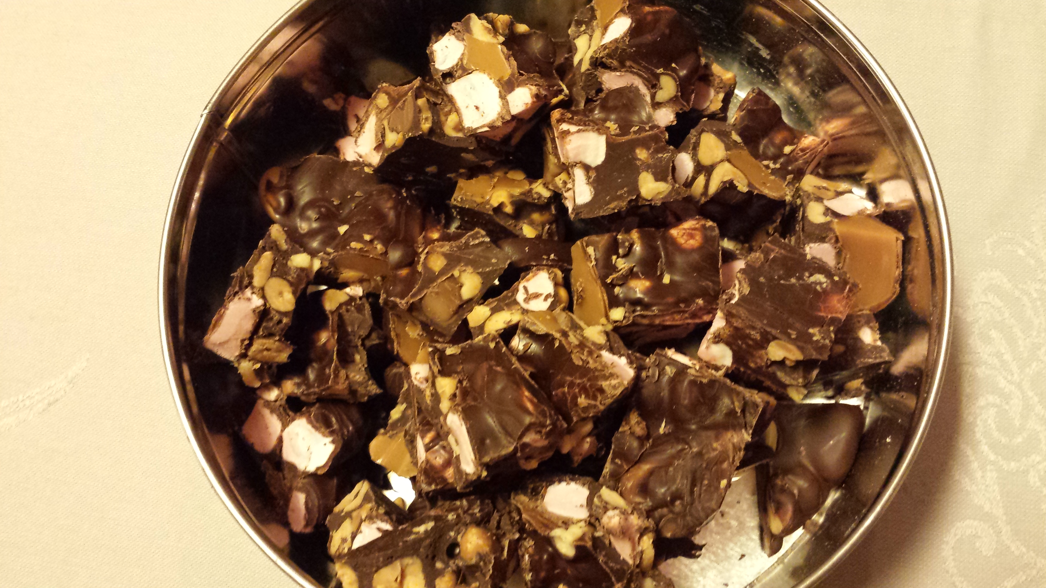 Smelt sjokoladen i vannbad, klipp skumfigurene i litt mindre biter. Ha disse, karamellene og peanøttene i en skål, hell over den smeltede sjokoladen og bland godt. Hell blandingen over på et fat med bakepapir, stryk utover til ca. 2 cm høyde, dekk til og ha i kjøleskapet til det har stivnet, del i biter og nyt!