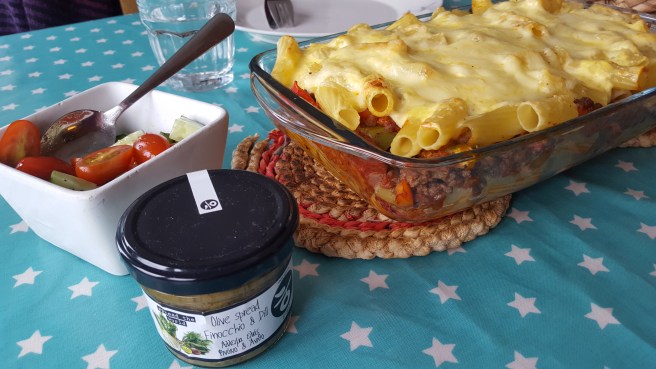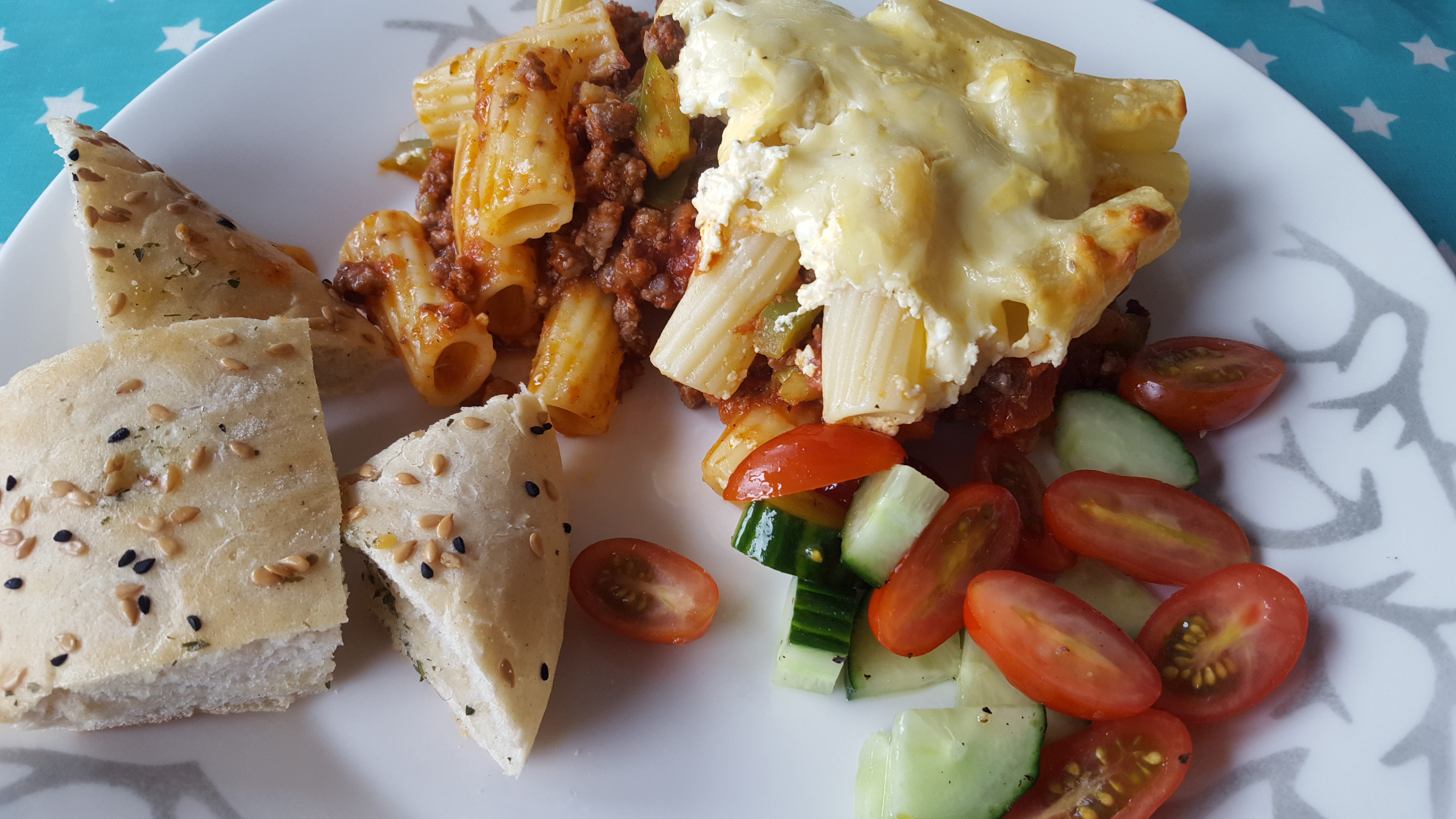 Legg kokt pasta og kjøttsausen lagvis i en ildfast form, ha over en topping laget av 1 egg, 150 gram naturell/gresk yoghurt, 50 gram fetaost og 50 gram vanlig ost. Bre toppingen utover på toppen og ha over litt ekstra revet ost. Stek i ovnen ca. 25 minutter. Jeg serverte med hvitløksbrød og agurk og tomater. Og en kjempegod «olive spread» med dill og fennikel som jeg kjøpte på en gresk taverna på Lillehammer i forrige uke.