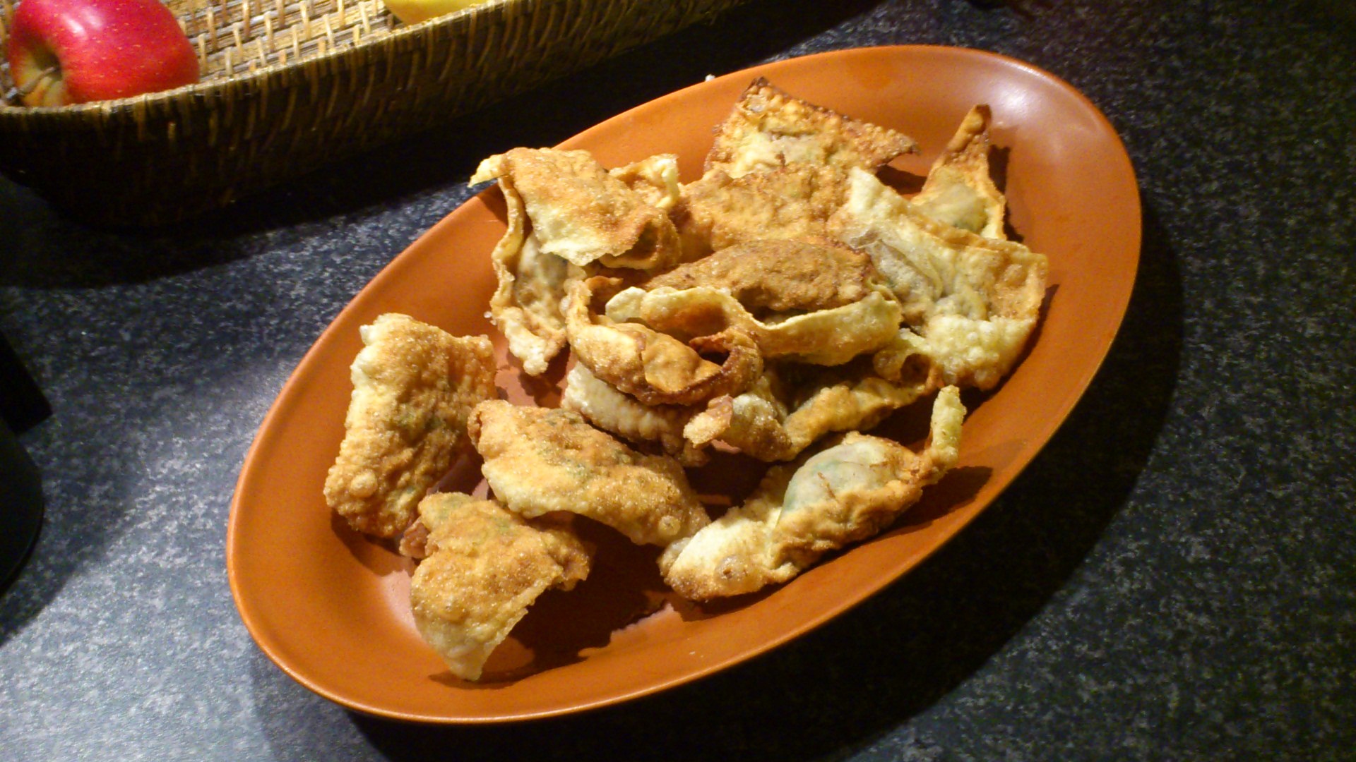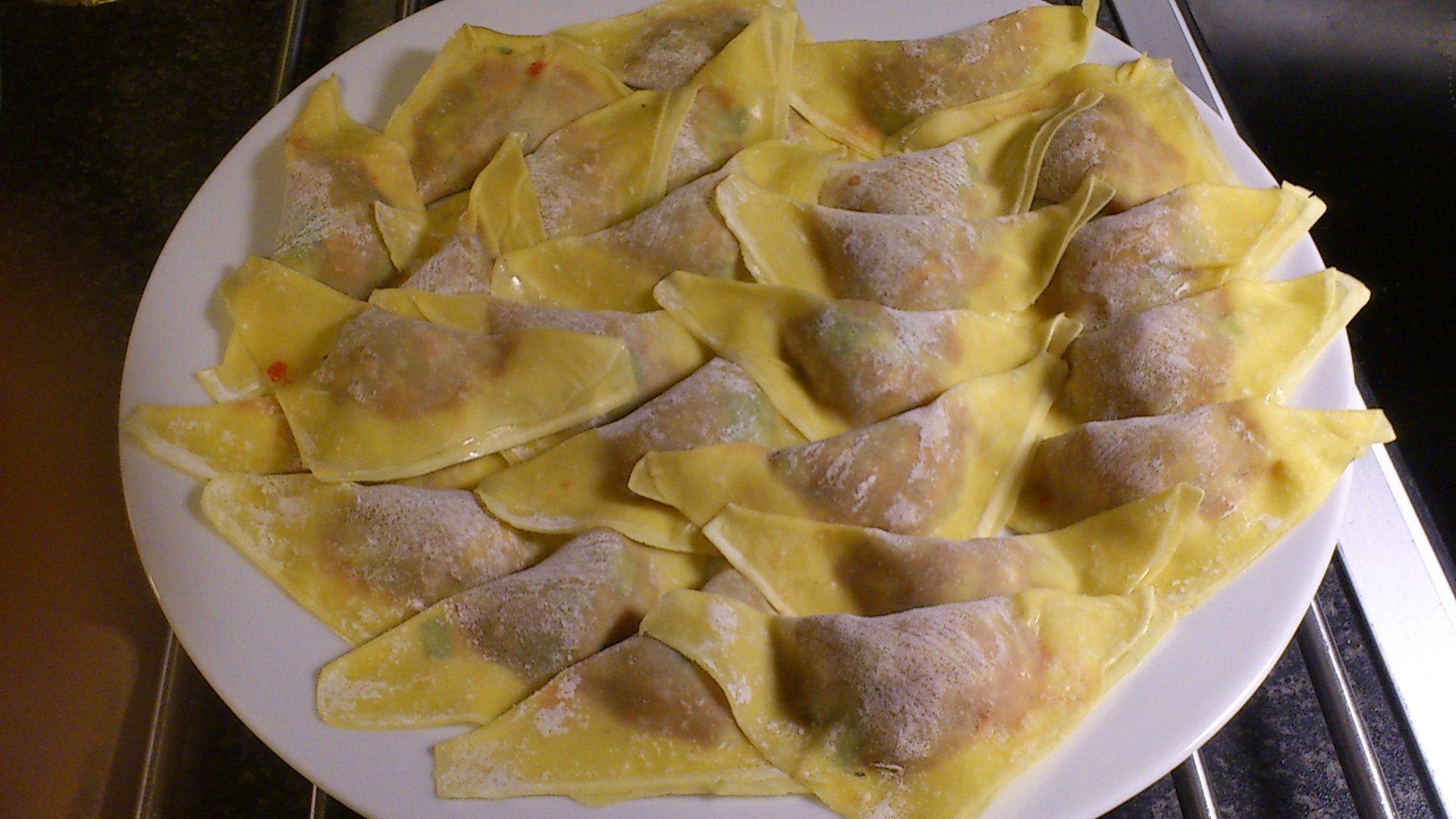 Pensle tortillaene med eggeplomme og strø med valmuefrø over. Skjær i trekanter og stek ved 175 grader i ca 5 minutter.