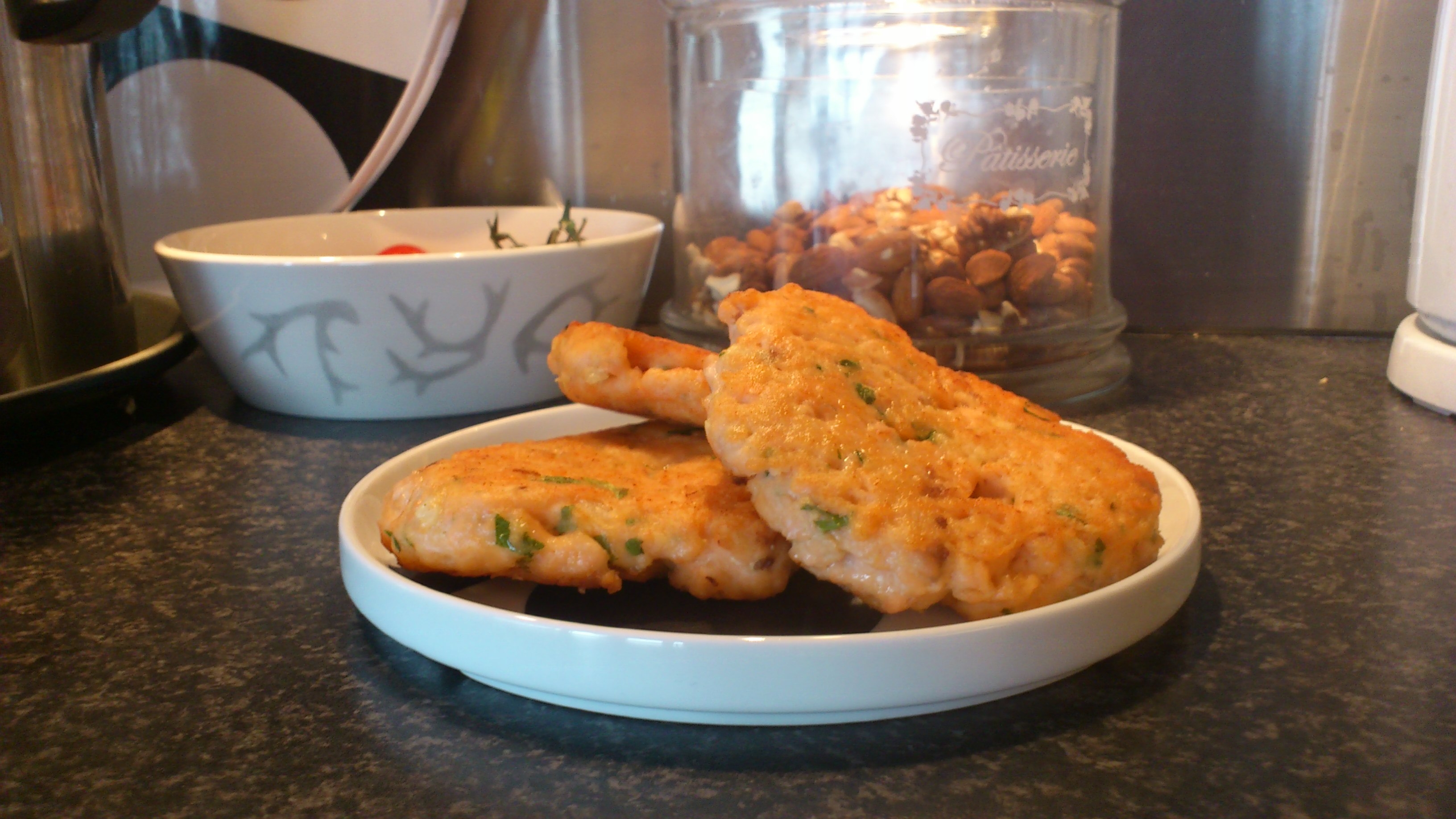 Lakseburgerne blander jeg i foodprosessor og steker i panna. Jeg fikk 6 burgere av dette: